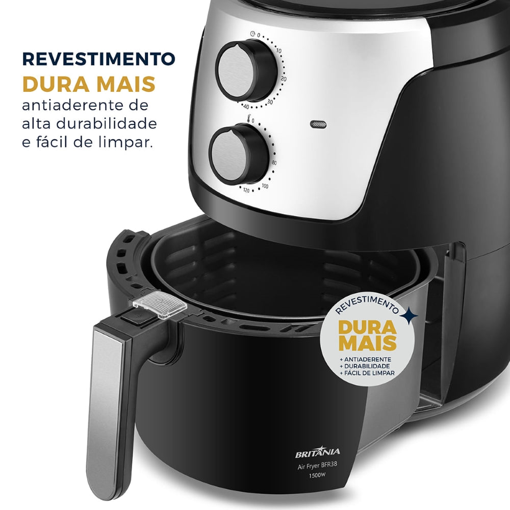 Conteúdo da embalagem: 1 Air Fryer Fritadeira Sem Óleo BFR38 1500W Britânia 4,2L Com Cesto Antiaderente 220V