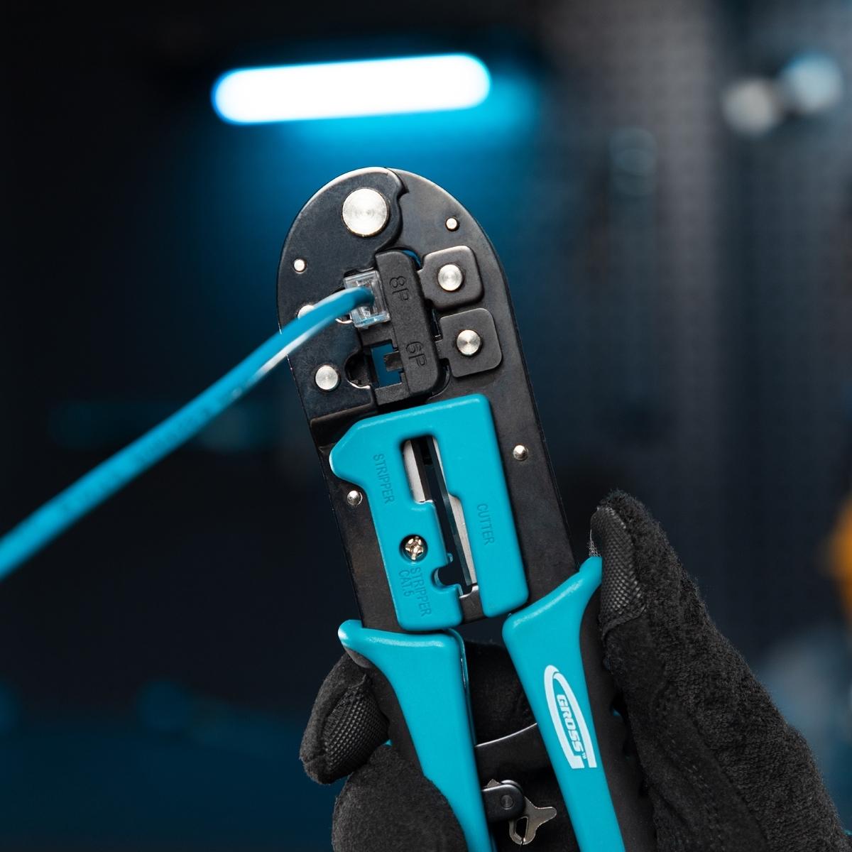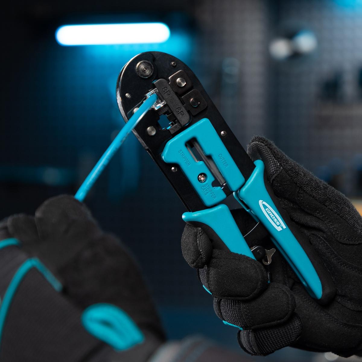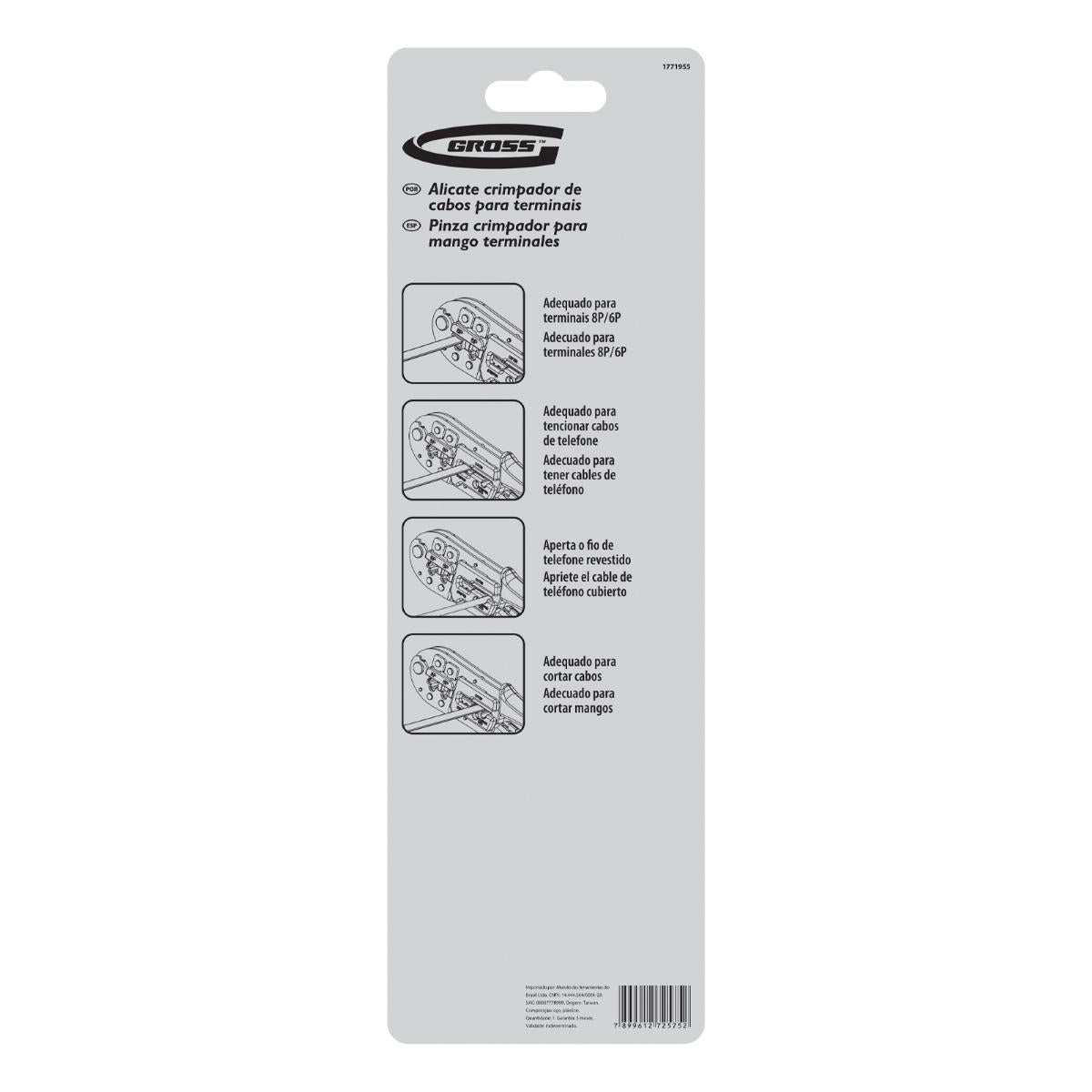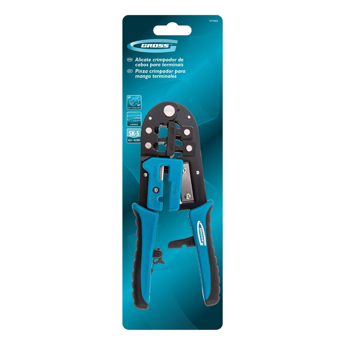 Garanta conexões de rede e telefonia impecáveis com o Alicate Crimpador de Cabos Gross 1771955. Projetado para profissionais e entusiastas, este alicate é a ferramenta ideal para crimpar terminais RJ45 (8P) e RJ11/12 (6P), proporcionando confiabilidade e eficiência na montagem de cabos de dados e telecomunicações. Fabricado em Taiwan, este alicate combina a precisão do aço japonês SK5 com um design ergonômico, oferecendo durabilidade, conforto e resultados superiores. Sua construção robusta e mecanismo de catraca minimizam o esforço, assegurando uma crimpagem consistente e de alta qualidade. Além de crimpar, ele também corta fios, tornando-o uma ferramenta versátil para todas as etapas da preparação de cabos. Invista em um alicate que eleva a qualidade das suas conexões e otimiza seu tempo de trabalho.