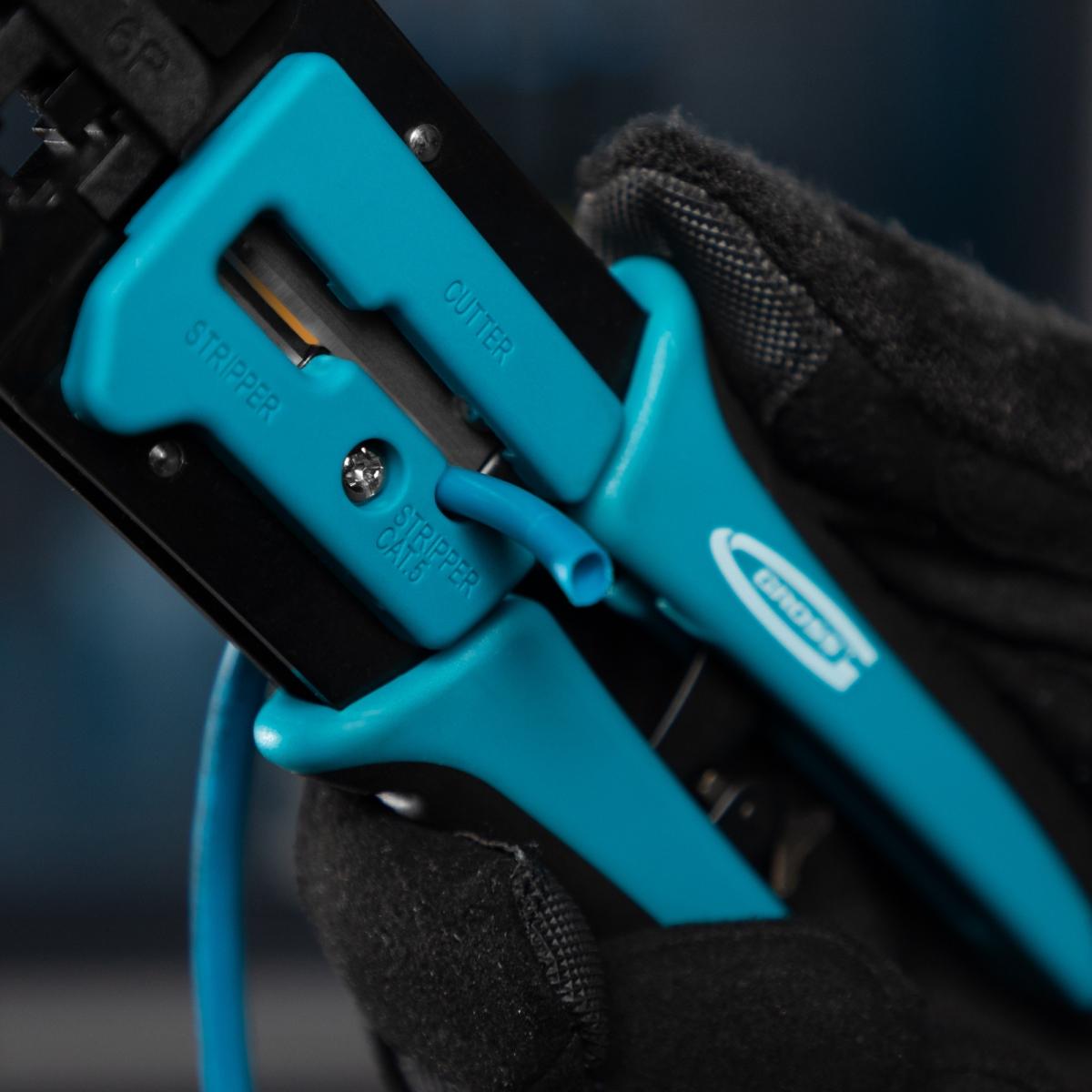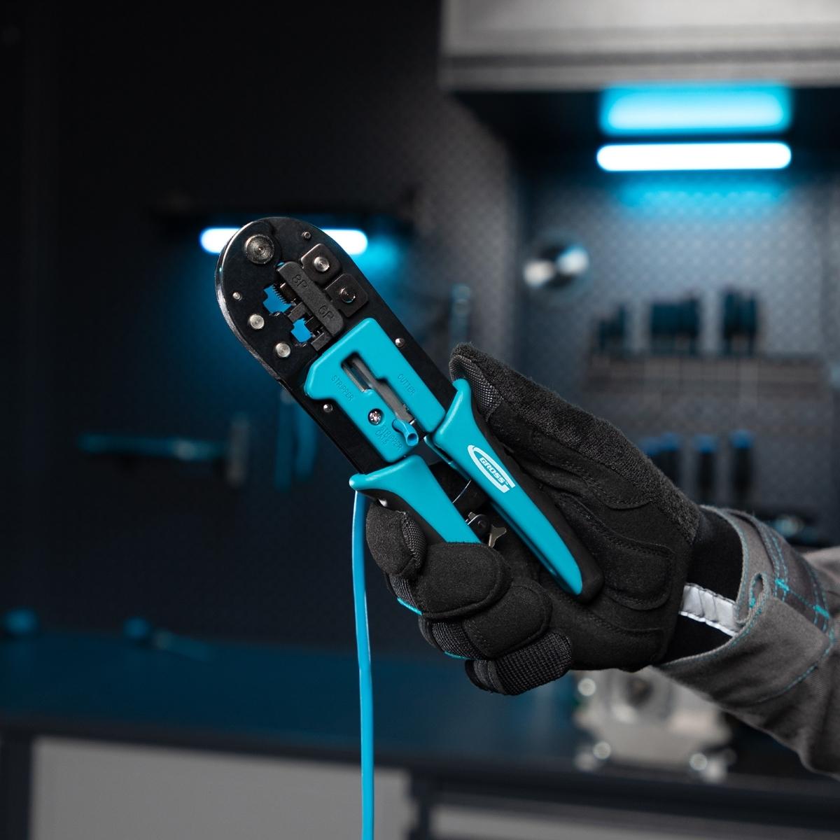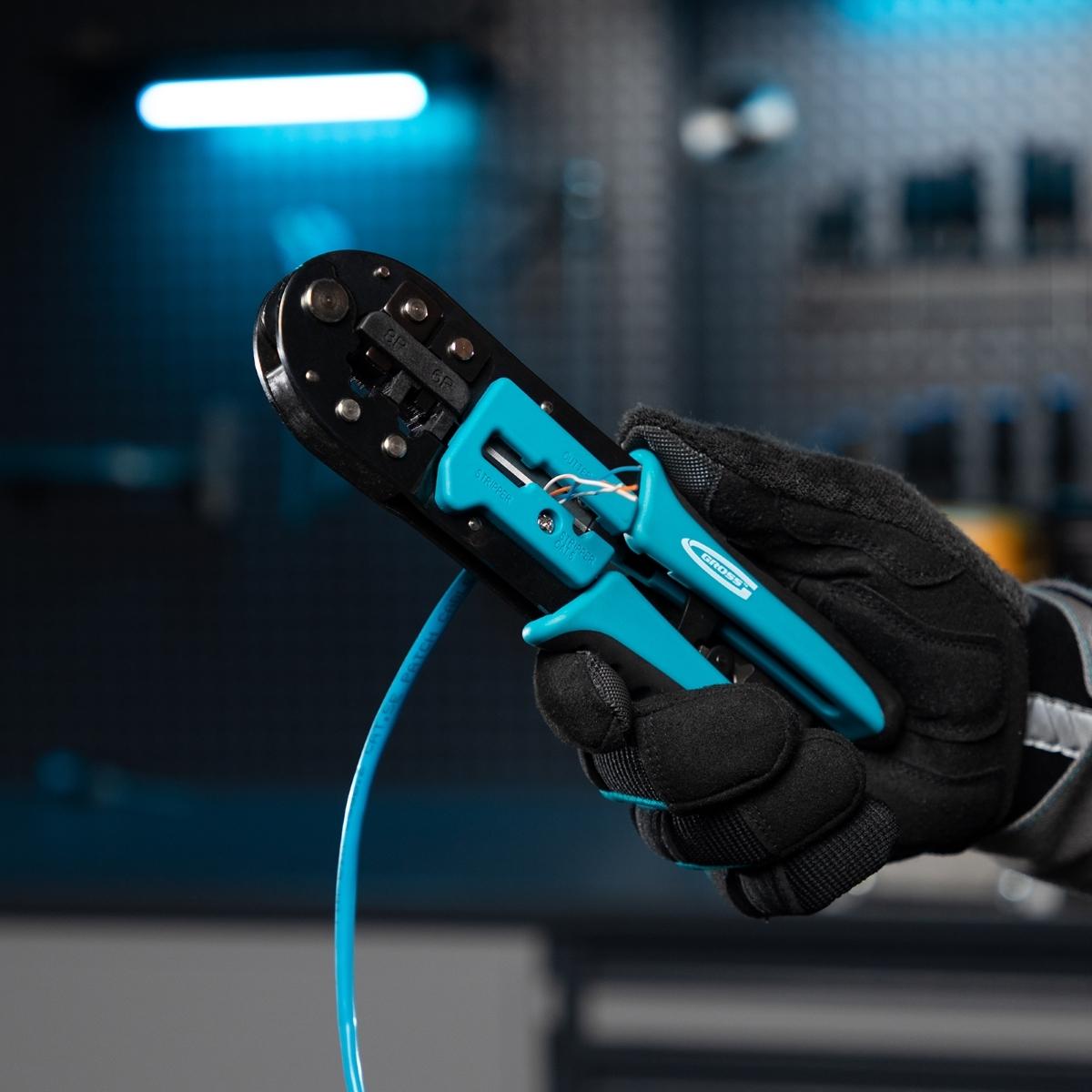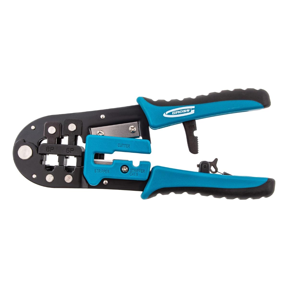 Garanta conexões de rede e telefonia impecáveis com o Alicate Crimpador de Cabos Gross 1771955. Projetado para profissionais e entusiastas, este alicate é a ferramenta ideal para crimpar terminais RJ45 (8P) e RJ11/12 (6P), proporcionando confiabilidade e eficiência na montagem de cabos de dados e telecomunicações. Fabricado em Taiwan, este alicate combina a precisão do aço japonês SK5 com um design ergonômico, oferecendo durabilidade, conforto e resultados superiores. Sua construção robusta e mecanismo de catraca minimizam o esforço, assegurando uma crimpagem consistente e de alta qualidade. Além de crimpar, ele também corta fios, tornando-o uma ferramenta versátil para todas as etapas da preparação de cabos. Invista em um alicate que eleva a qualidade das suas conexões e otimiza seu tempo de trabalho.