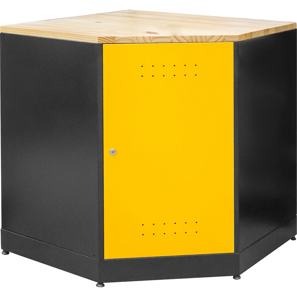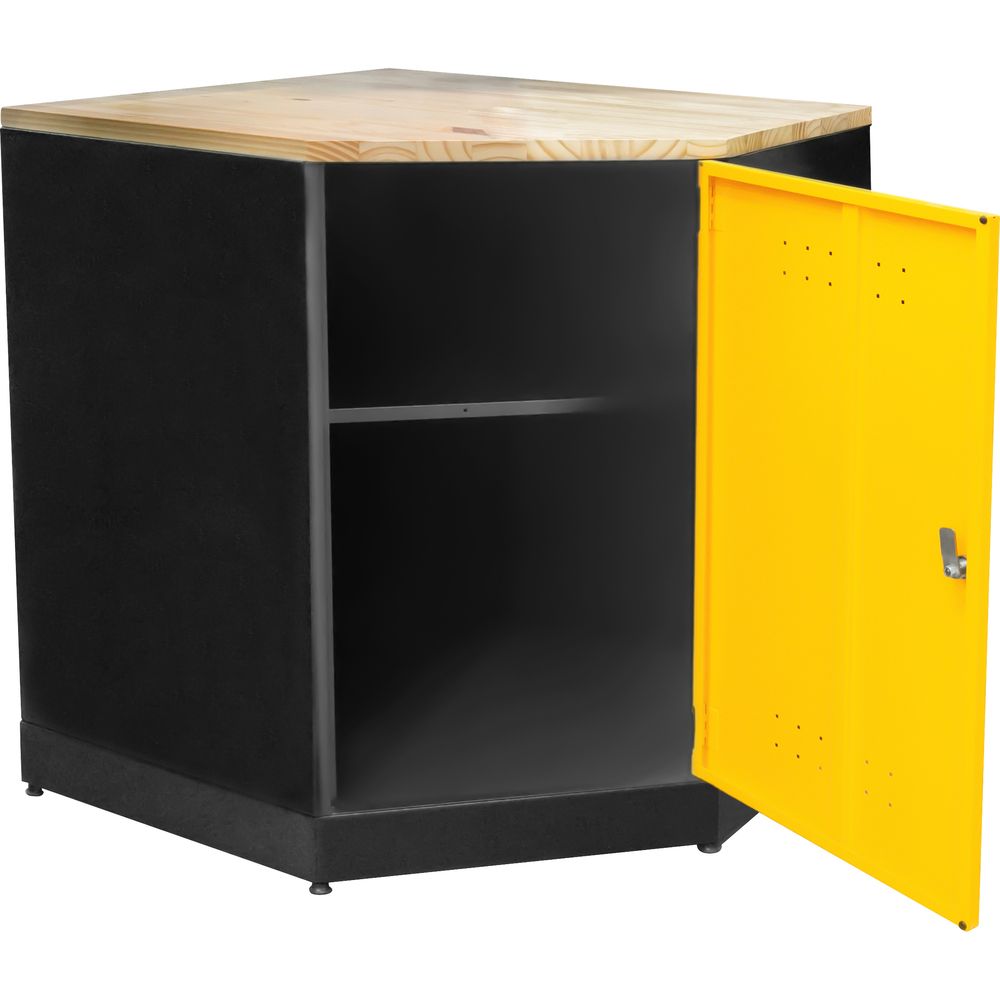 Armário de canto, todo confeccionado em aço carbono, com tampo em madeira de pinus fingada e envernizada, e pintura eletrostática a pó, que aliados à fechadura reforçada (acompanha duas chaves), garantem maior segurança e durabilidade ao produto. Seu design permite ótimo aproveitamento de espaços.