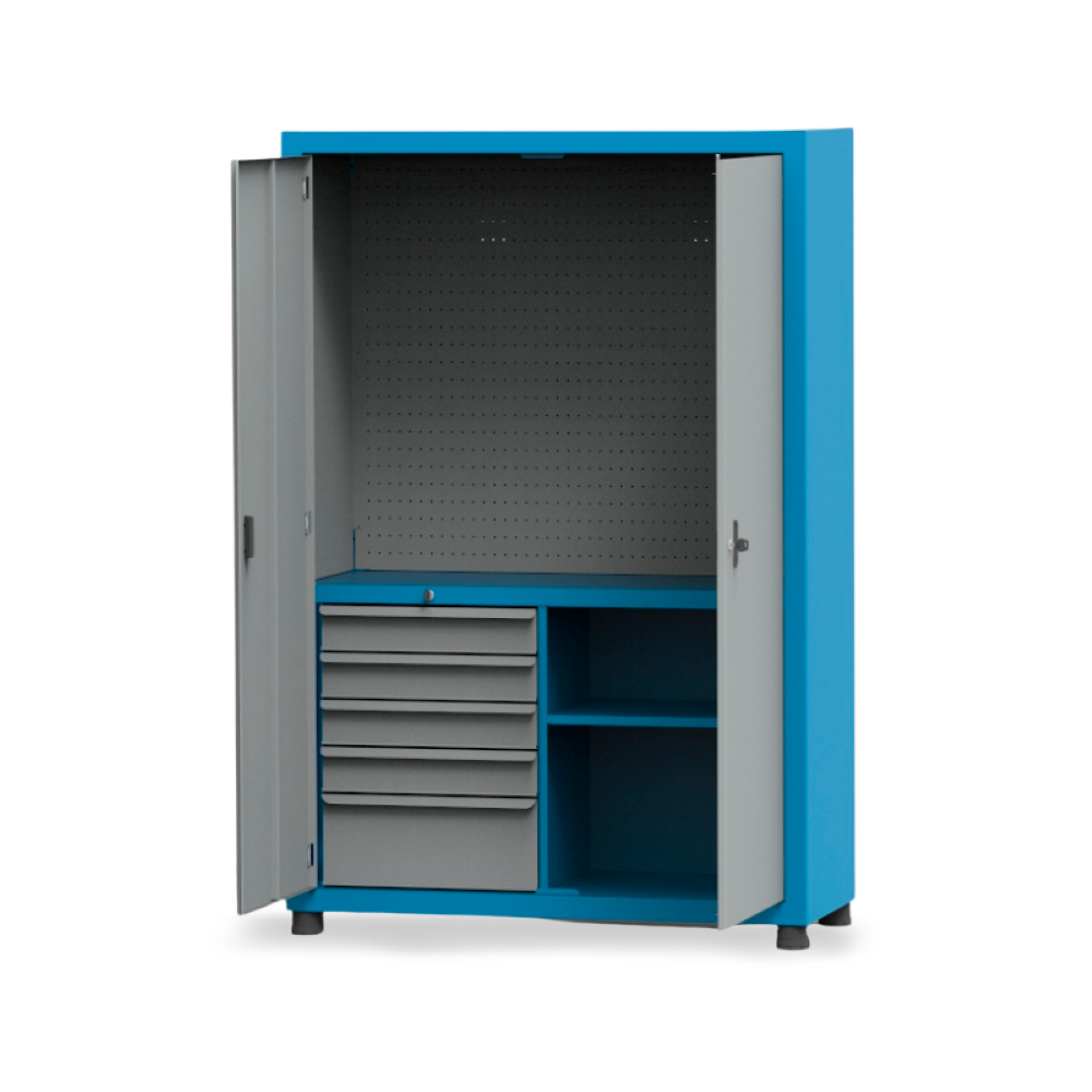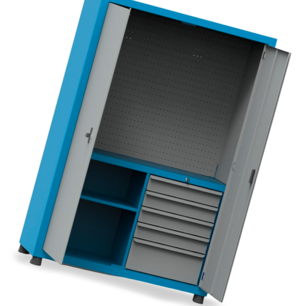 Armário Para Ferramentas com 1 Prateleira Fixa, 5 Gavetas e Painel Perfurado é fabricado em chapas de aço carbono resistentes, recebe tratamento de superfície anticorrosivo e finalmente recebe um acabamento de tinta eletrostática a pó. É ideal para quem busca um produto diferenciado no mercado, de alta qualidade e durabilidade!