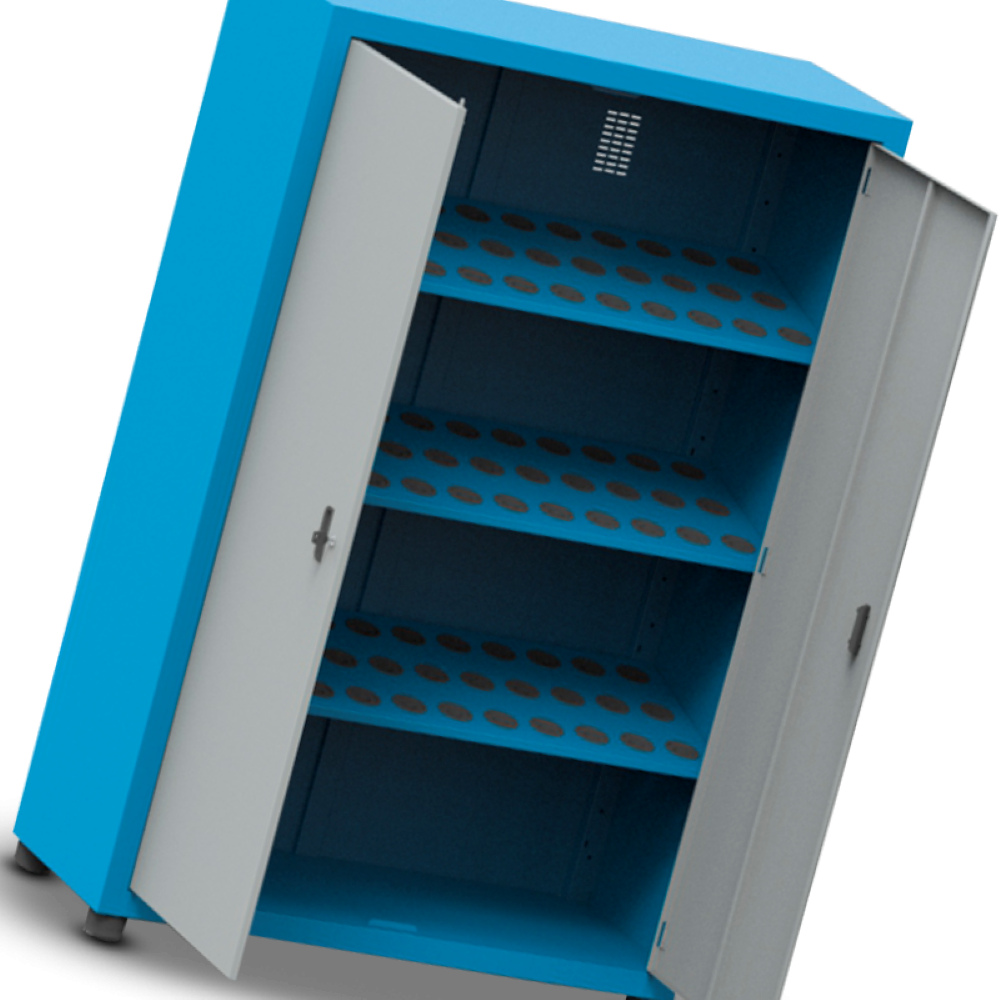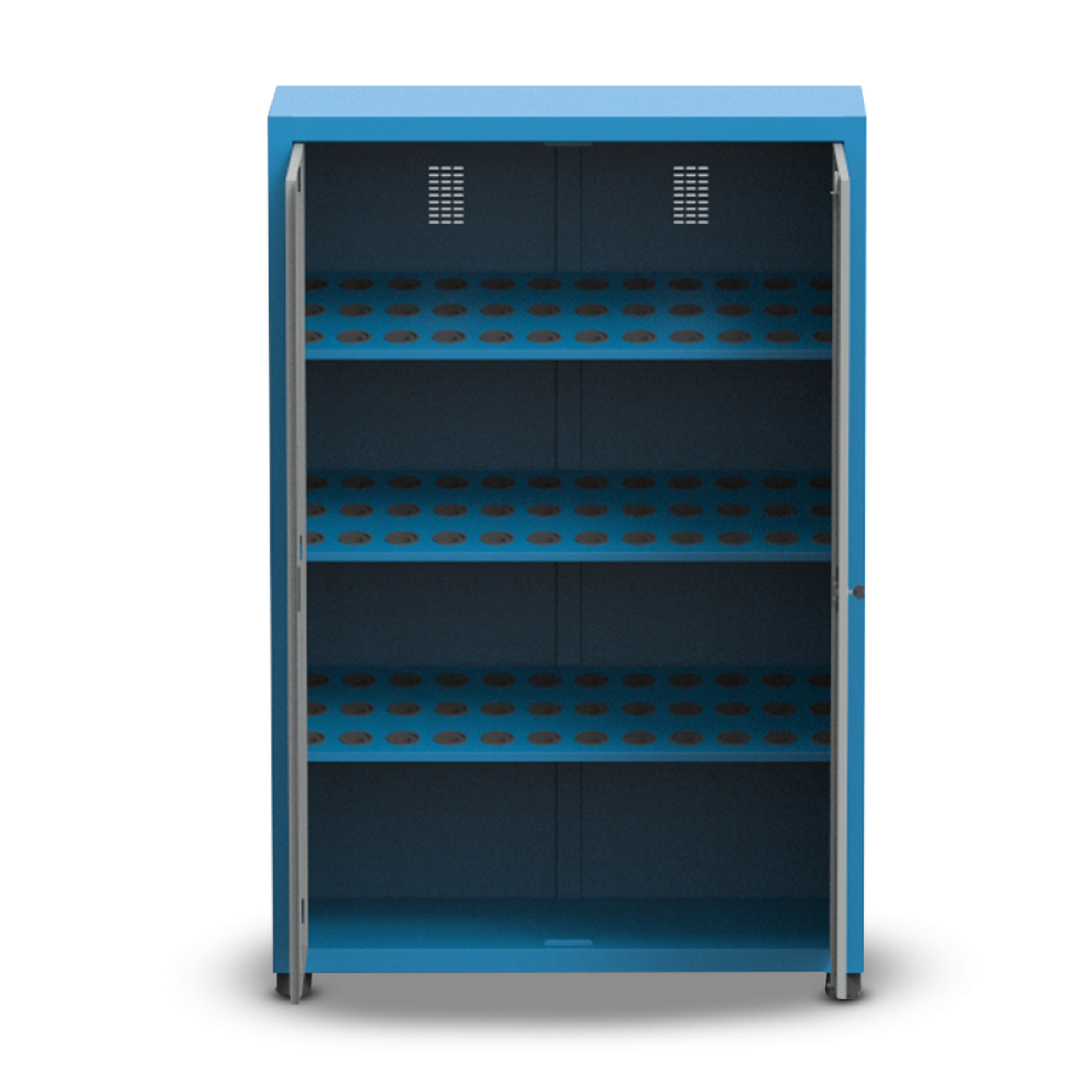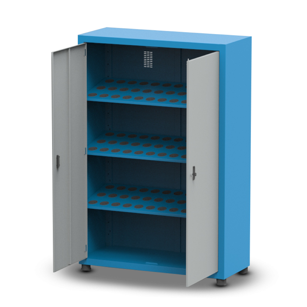 O Armário Porta Cone ISO30 para 108 peças com 3 prateleiras possui pés niveladores e detém uma capacidade de 50kg por prateleira.