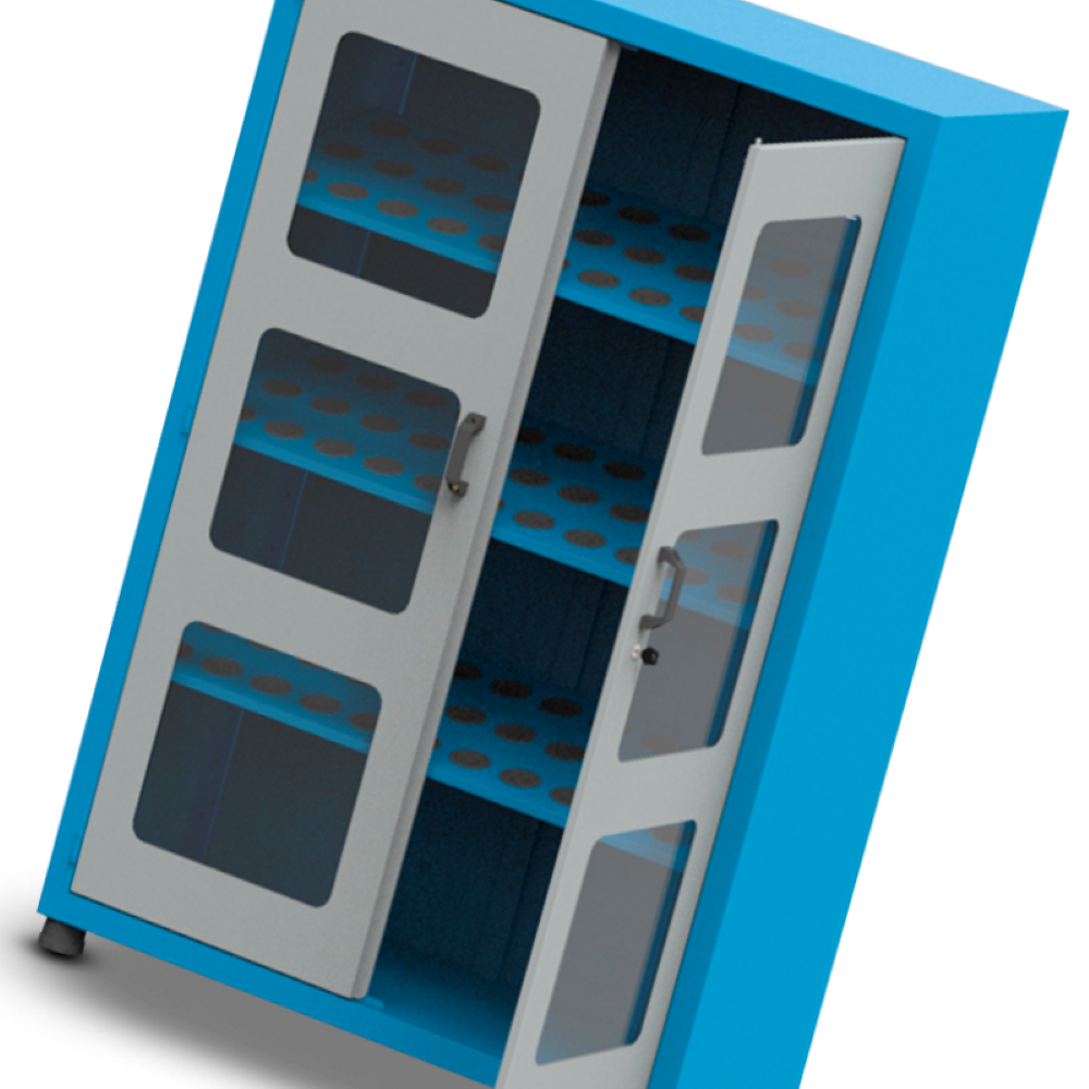 O Armário Porta Cone ISO30 para 108 peças com 3 prateleiras e Visor de Acrílico possui pés niveladores e detém uma capacidade de 50kg por prateleira.
