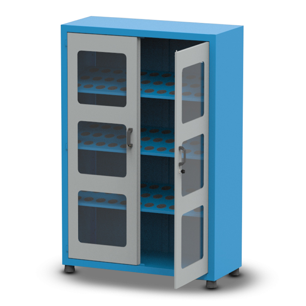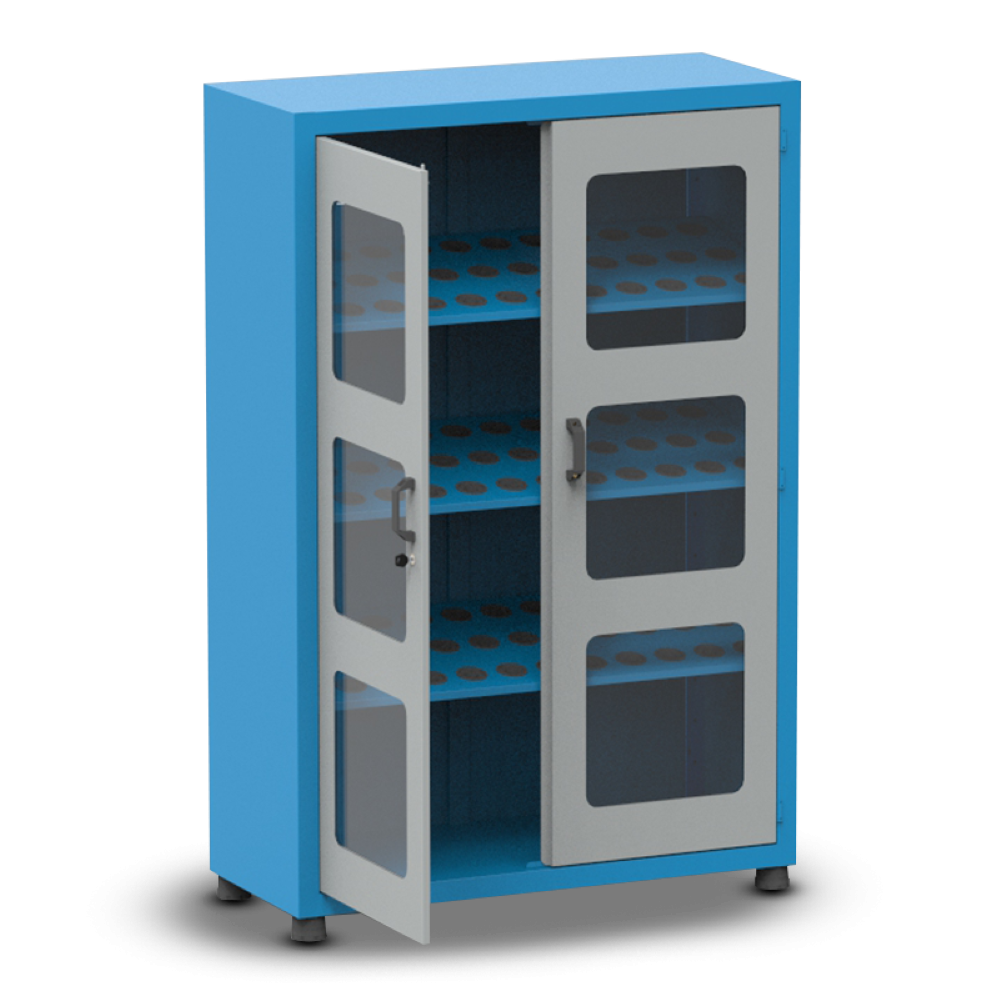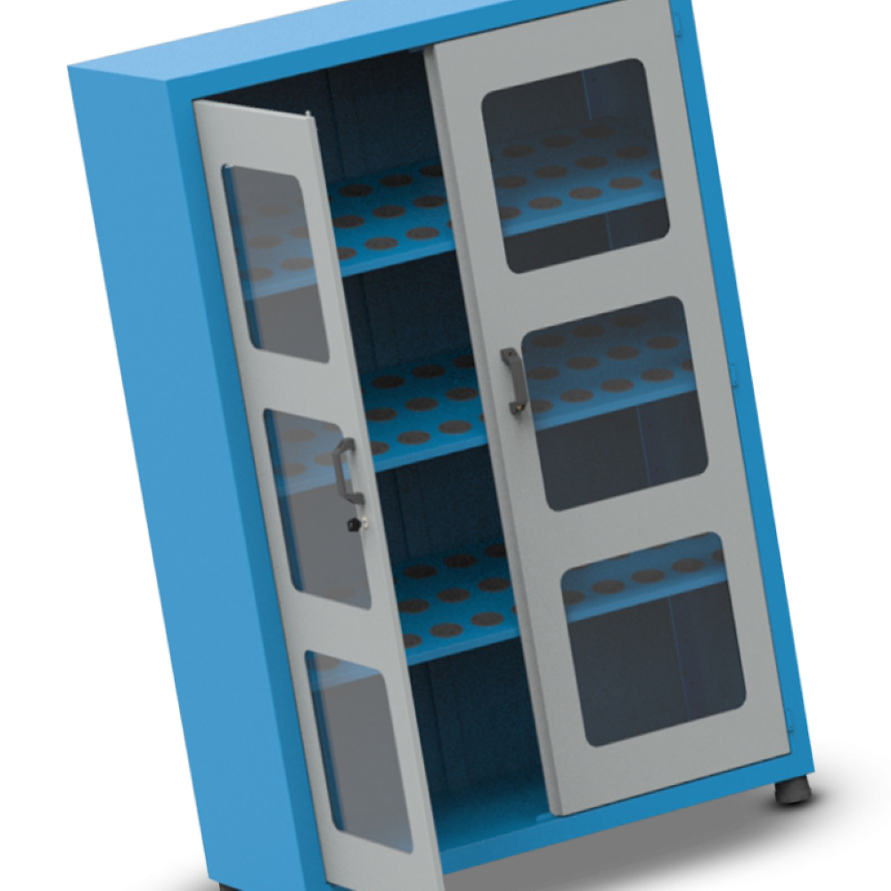O Armário Porta Cone ISO40 para 90 peças com 3 prateleiras e Visor de Acrílico possui pés niveladores e detém uma capacidade de 50kg por prateleira.