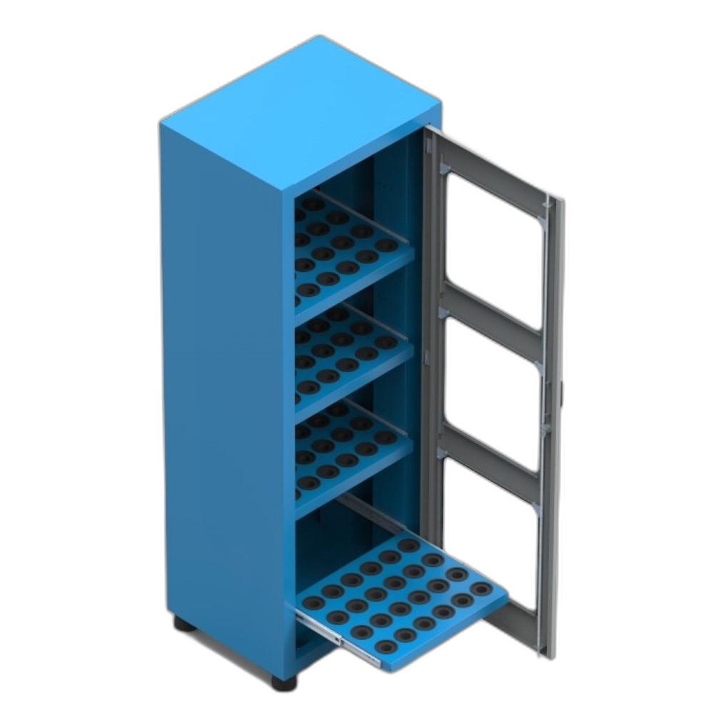 Fabricado em aço carbono, modelo pequeno e possui 4 prateleiras porta cones ISO30 para 96 peças.