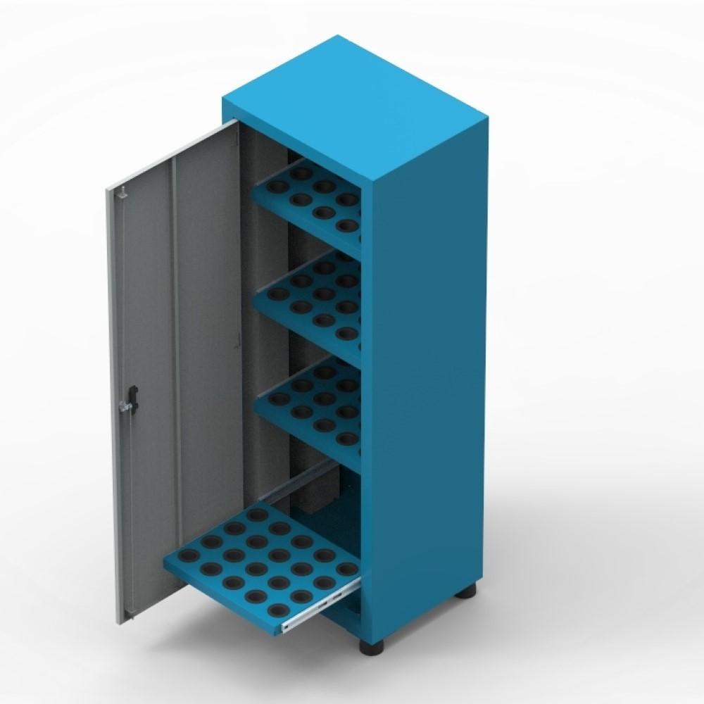 O Armário Porta Cone ISO40 para 80 peças com 4 prateleiras possui pés niveladores e detém uma capacidade de 25kg por prateleira.