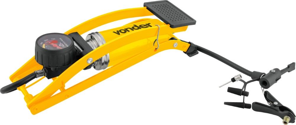 1 Bomba de ar com pedal e manômetro. Acompanha: 1 agulha para encher bolas, 2 bicos para encher infláveis e 1 adaptador.