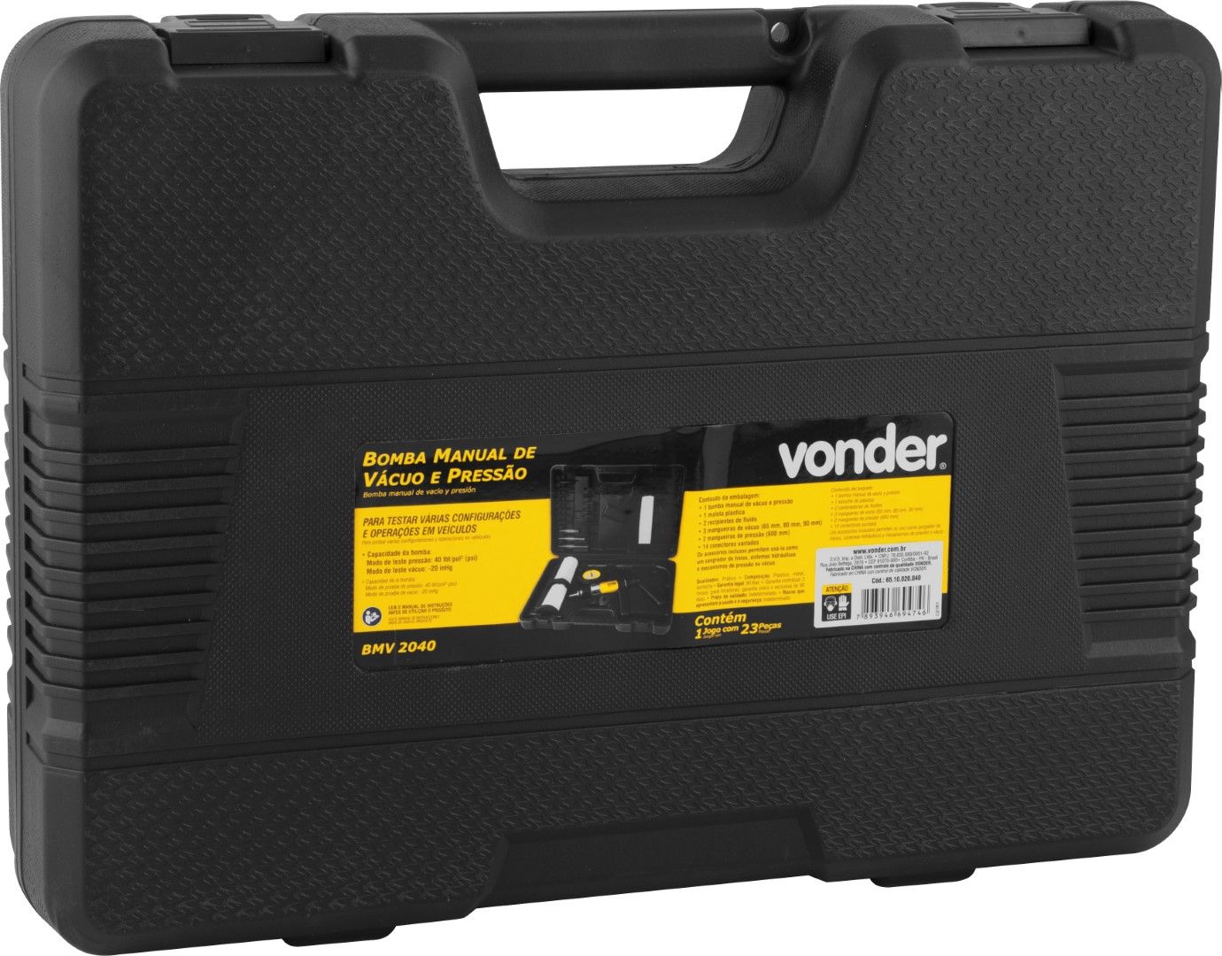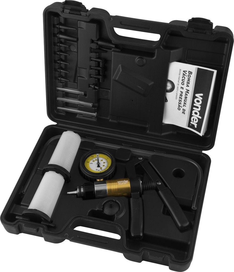 Conteúdo da embalagem: 1 Bomba manual de vácuo e pressão. Acompanha: maleta plástica, 2 recipientes de fluido, 3 mangueiras de vácuo (65 mm, 80 mm, 90 mm), 2 mangueiras de pressão (600 mm) e 14 conectores variados.
