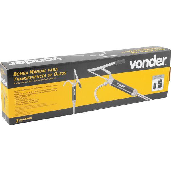 Conteúdo da embalagem 1 Bomba Aplicações e dicas de uso Ideal para transferência de óleo lubrificante por meio de bombeamento por alavanca. Indicada para óleos tipo: SAE 30 a SAE 140. Destaques e diferenciais Possui tubo de sucção telescópico para adaptação em tambores plásticos ou metálicos de 50 e 200 litros