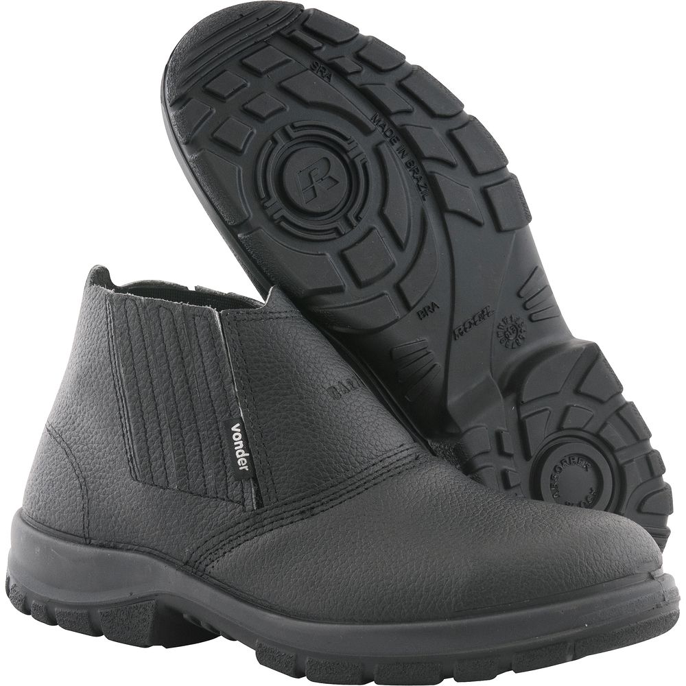 Calçado de segurança tipo botina com fechamento em elástico lateral, confeccionado em couro curtido ao cromo. Possui palmilha de montagem em material sintético fixada pelo sistema strobel e solado de poliuretano bidensidade, que proporciona maior conforto. Conta com biqueira de composite, um composto formado por fibra de carbono, vidro e poliéster especial, sem componentes metálicos, um material que, aparentemente, lembra o plástico. Resistente contra impacto e ao óleo combustível, mais leve que biqueira de aço.