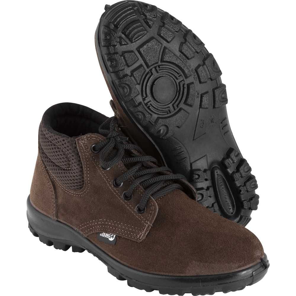 Calçado ocupacional de uso profissional tipo botina, fechamento em cadarço com ilhós, confeccionado em couro curtido ao cromo, colarinho em material têxtil, forro da gáspea em não tecido, forro lateral em tecido, palmilha de montagem em material sintético fixada pelo sistema strobel, palmilha interna em EVA com tecido, contraforte em material sintético termoconformado, biqueira plástica para conformação, solado de poliuretano monodensidade antiderrapante injetado diretamente no cabedal.