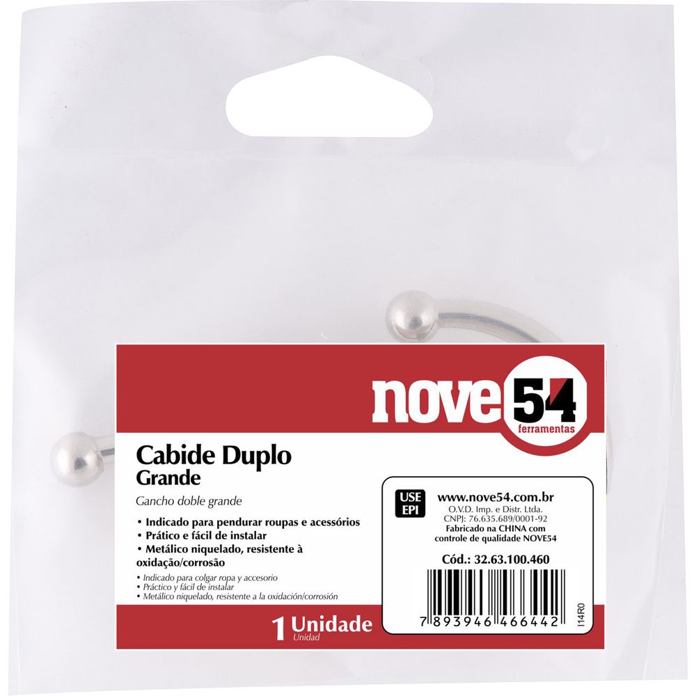 Conteúdo da embalagem 1 Cabide Aplicações e dicas de uso Indicado para pendurar roupas e acessórios Destaques e diferenciais Possui acabamento niquelado, proporcionando maior resistência à oxidação/corrosão. Prático e fácil de instalar.