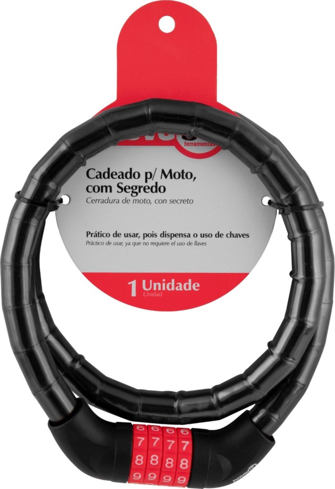 Indicado para trancar ou prender motos. Segredo com 4 algarismos. O segredo original são os números 0 0 0 0, que devem ser alterados para a numeração de preferência do usuário. A combinação de números (segredo escolhido) deverá ser anotada em local seguro, pois em caso de esquecimento não será mais possível abrir o cadeado.