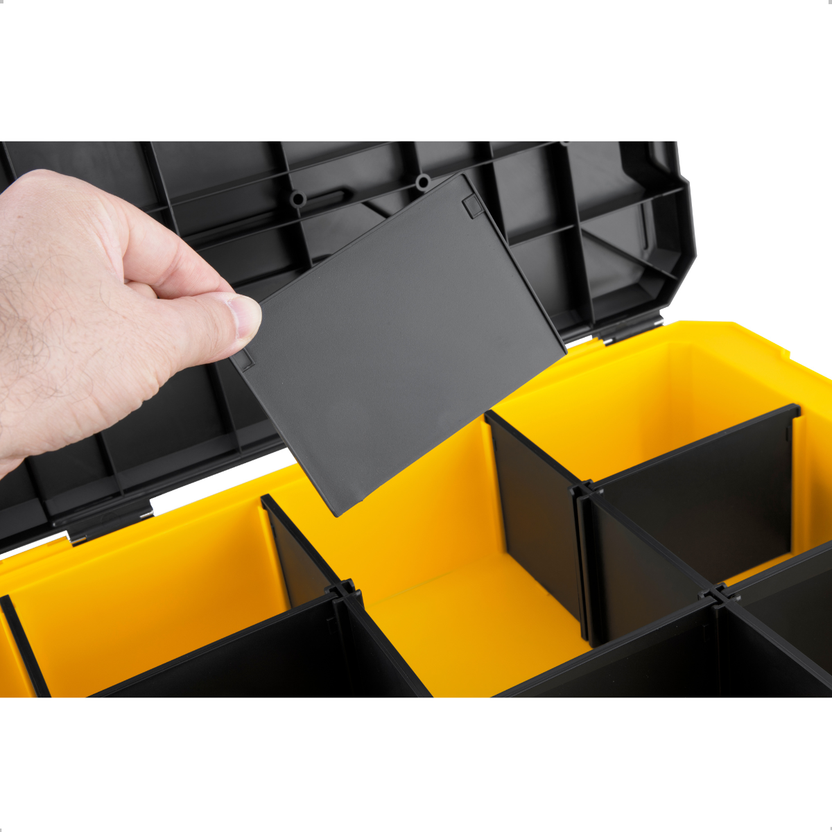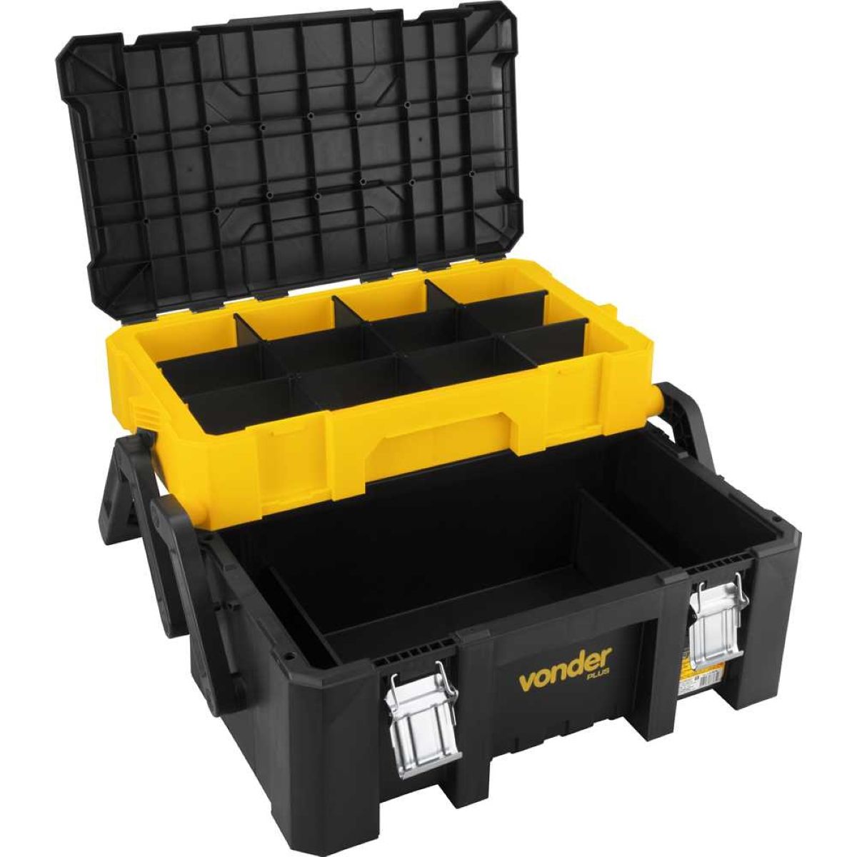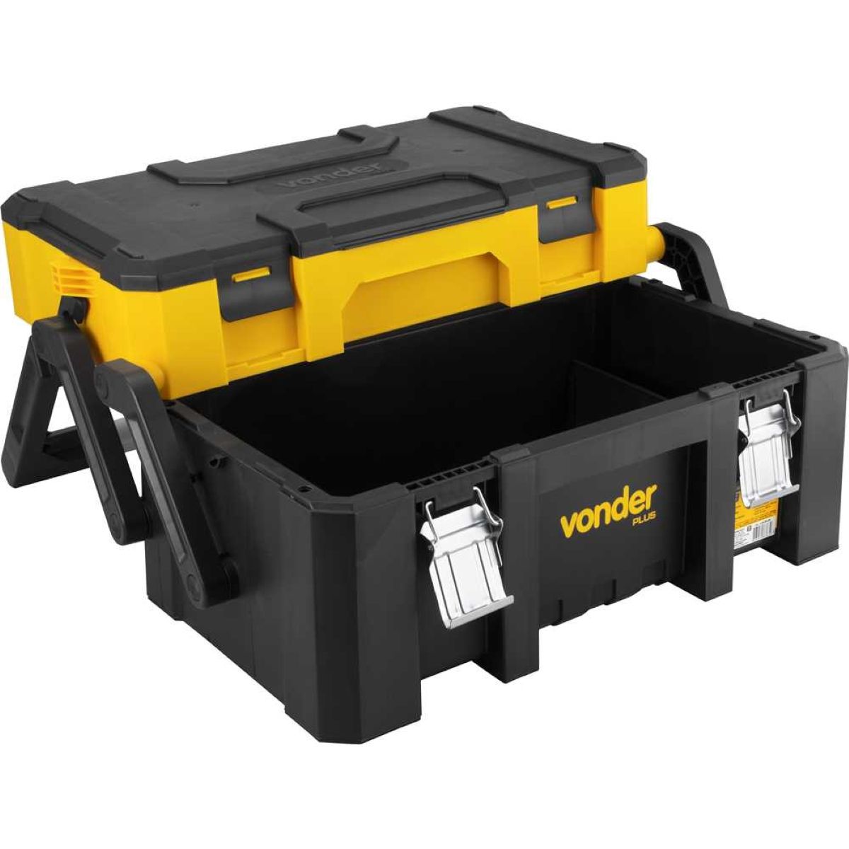O grande diferencial desta caixa está em seu sistema Cantilever, que facilita o acesso rápido às ferramentas armazenadas em dois compartimentos distintos. No compartimento superior, você conta com 12 divisões fixas, ideais para parafusos, buchas, brocas e pequenos acessórios. Já o compartimento inferior possui 2 divisões fixas, perfeitas para armazenar ferramentas maiores como chaves, alicates e trenas, mantendo tudo organizado e ao alcance das mãos.