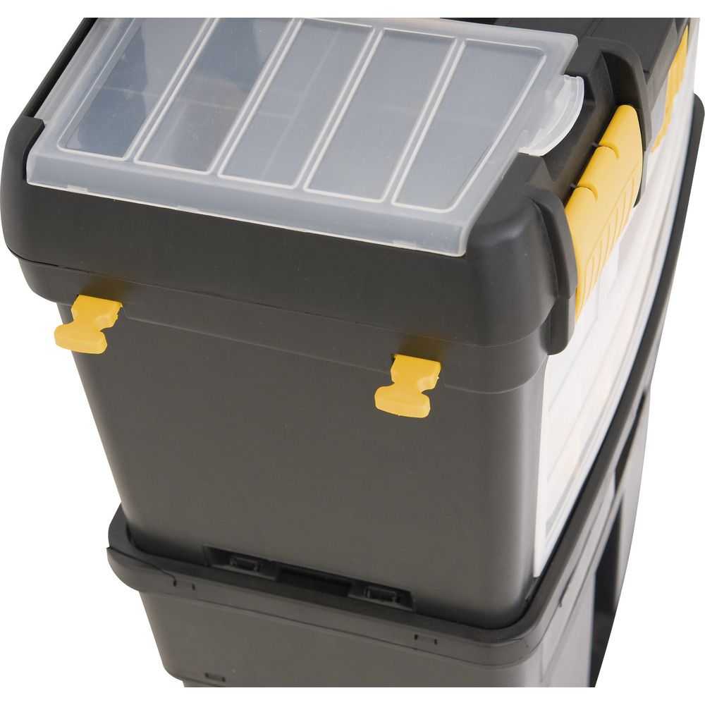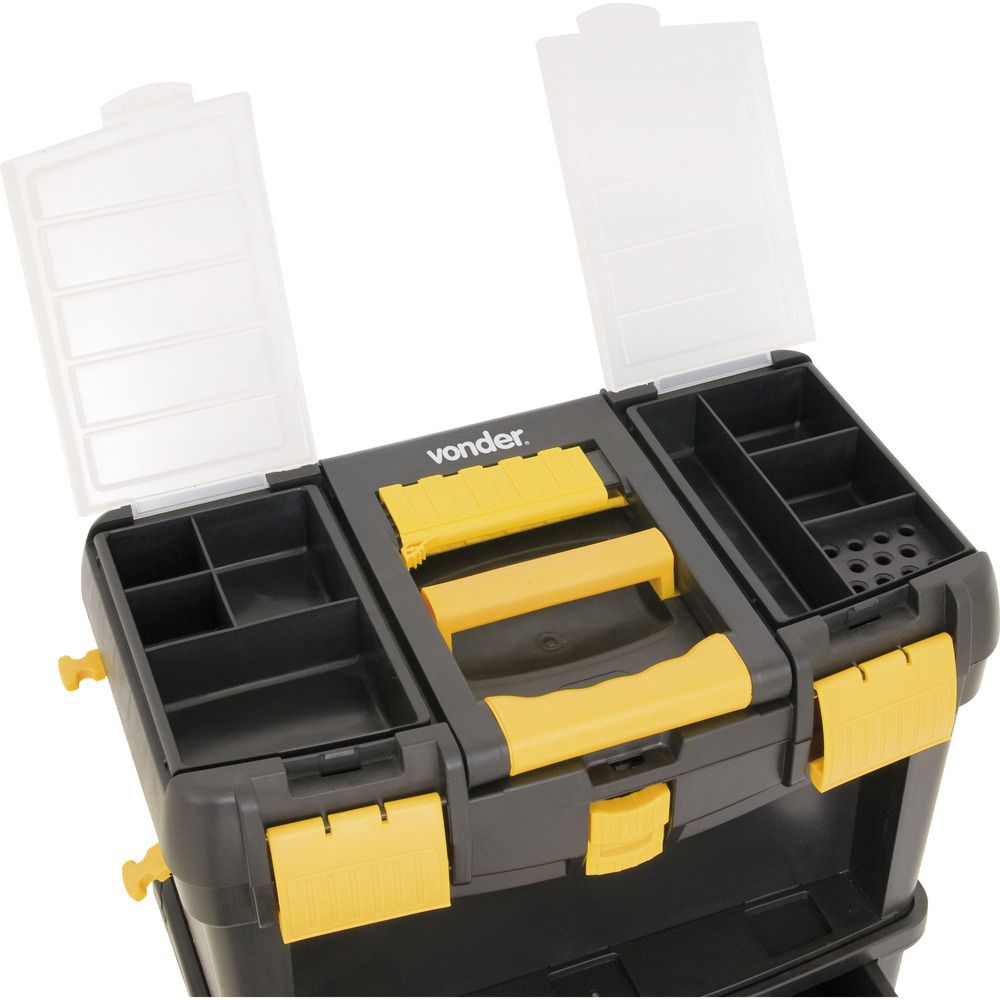 Feita de polipropileno, a caixa é resistente e durável, suportando até 25 kg de carga. A combinação de cores preta e amarela não só confere um visual moderno, mas também facilita a identificação em ambientes de trabalho. A ergonomia da alça e a facilidade de manuseio das rodas em diferentes superfícies tornam o transporte mais confortável, economizando tempo e esforço.