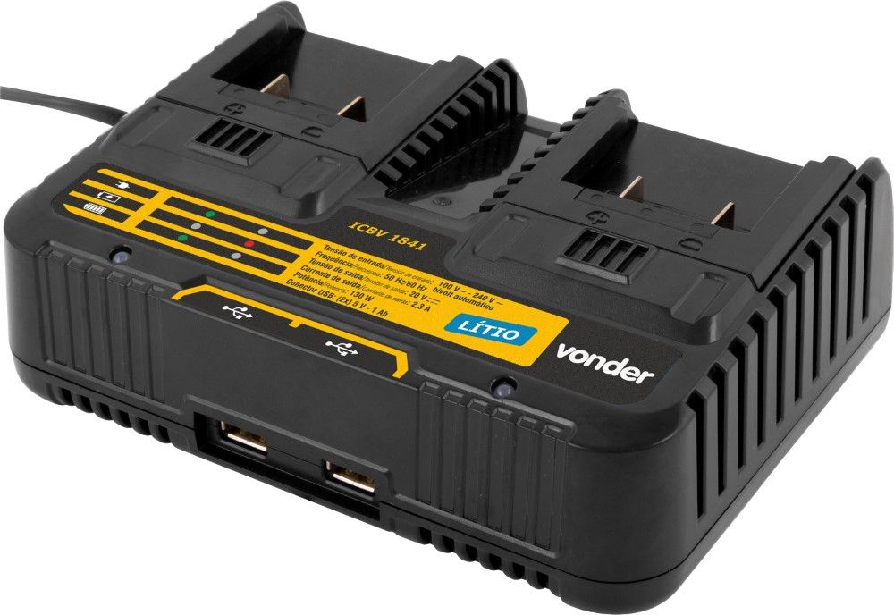 Possibilita o carregamento simultâneo de duas baterias. Conta ainda com duas saídas USB 5V - 1A, possibilitando o carregamento de smartphones, por exemplo. Além de bivolt automático e LEDs indicadores de carregamento.