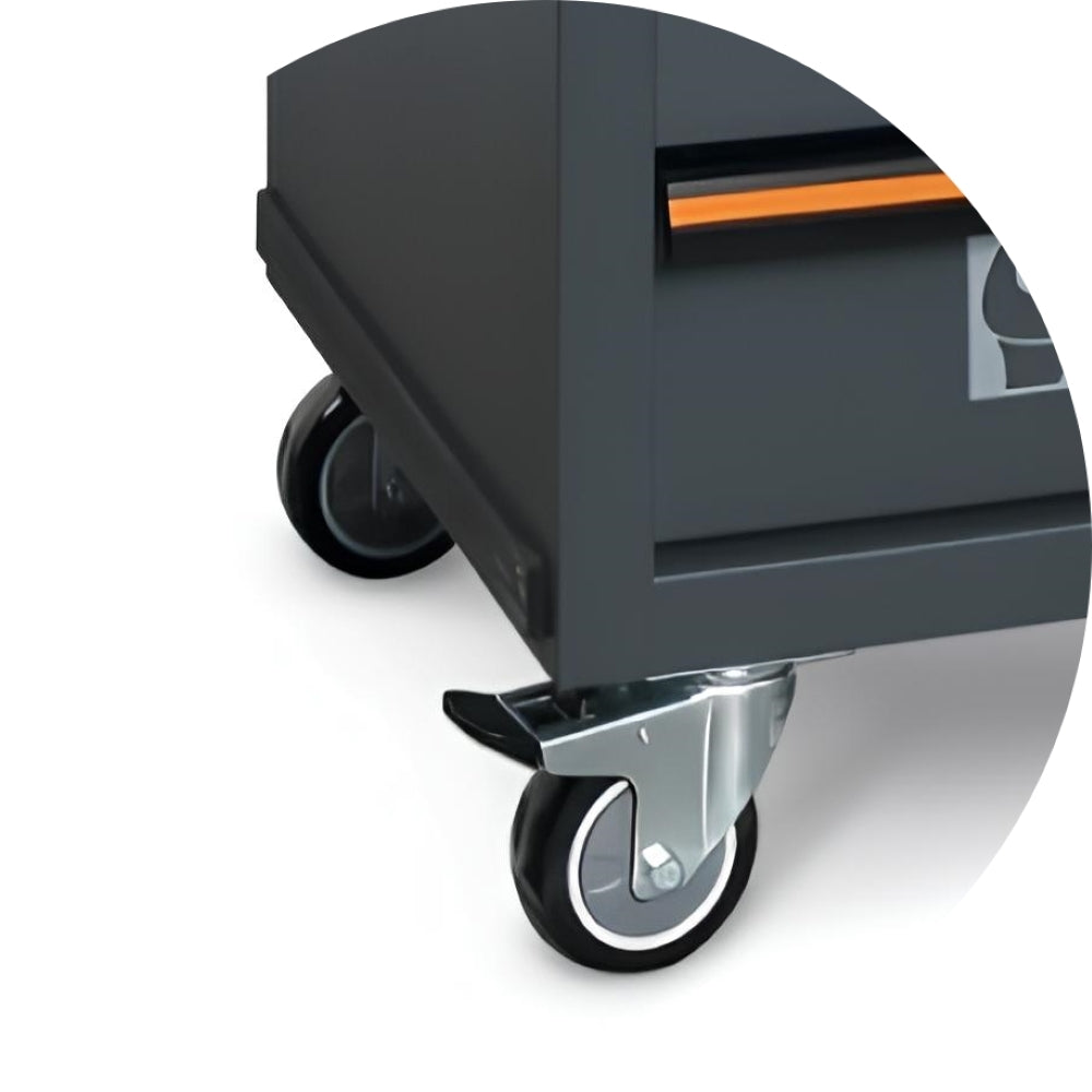 Rodízios Direcionais: Equipado com 4 rodízios direcionais de Ø 100 mm, sendo 1 com freio, proporcionando mobilidade e estabilidade ao carro.