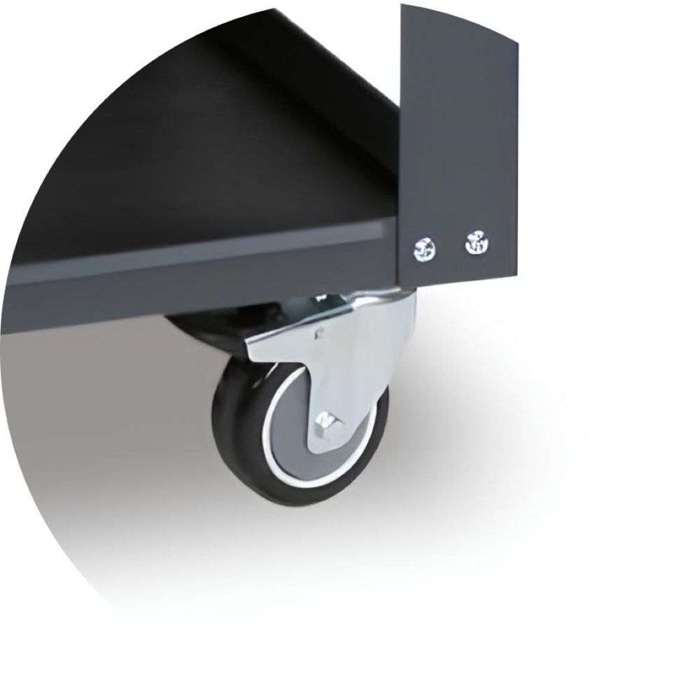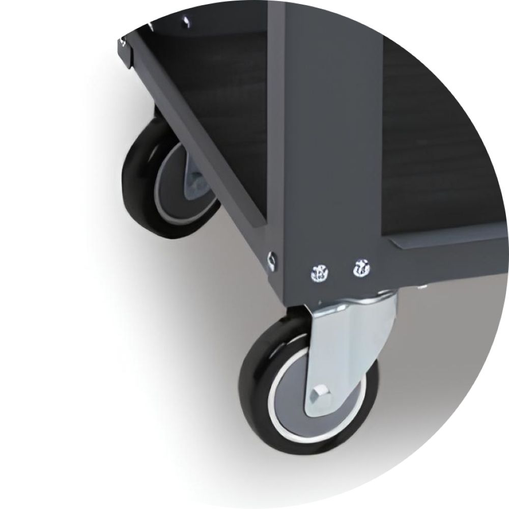 Rodízios Giratórios: Equipado com 4 rodas giratórias de Ø 100 mm, sendo uma delas com freio para maior estabilidade.