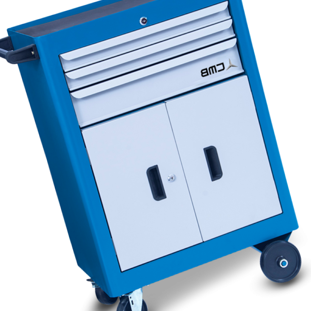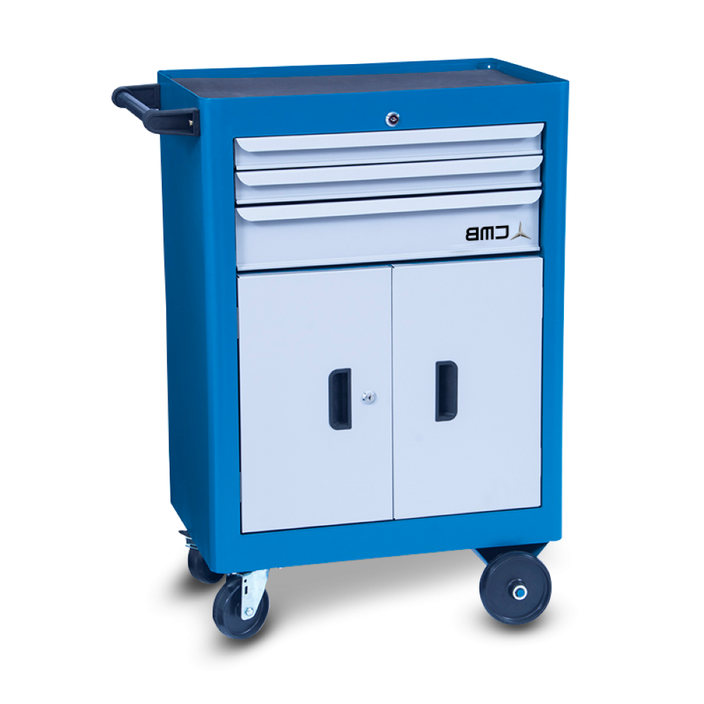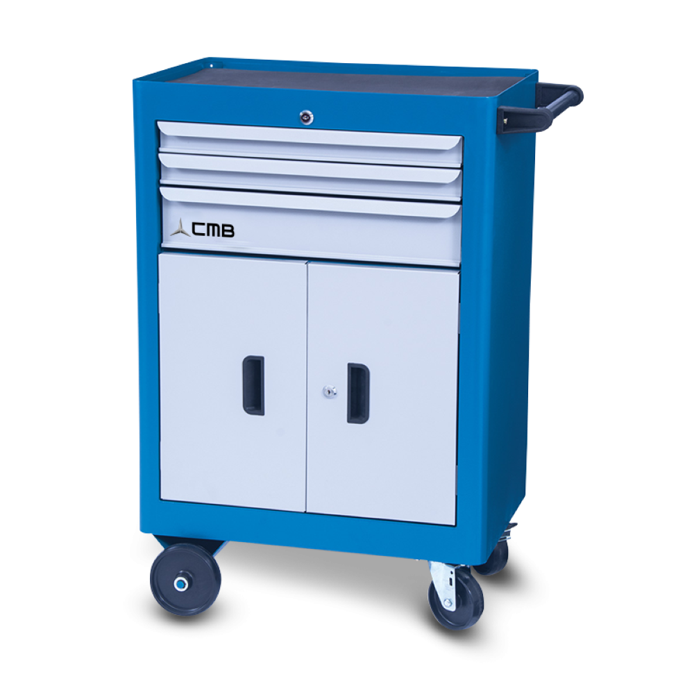 Carrinho para Ferramenta com 1 Bandeja, 3 Gavetas e 2 Portas é fabricado em chapas de aço carbono resistentes, recebe tratamento de superfície anticorrosivo e finalmente recebe um acabamento de tinta eletrostática a pó.
