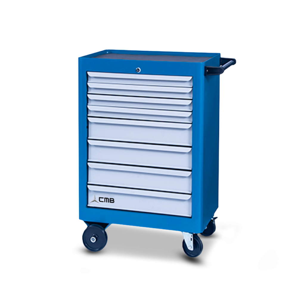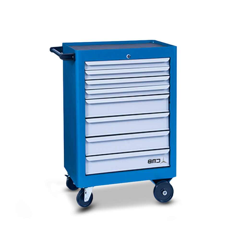 Carrinho para Ferramenta com 1 Bandeja e 8 Gavetas é fabricado em chapas de aço carbono resistentes, recebe tratamento de superfície anticorrosivo e finalmente recebe um acabamento de tinta eletrostática a pó.