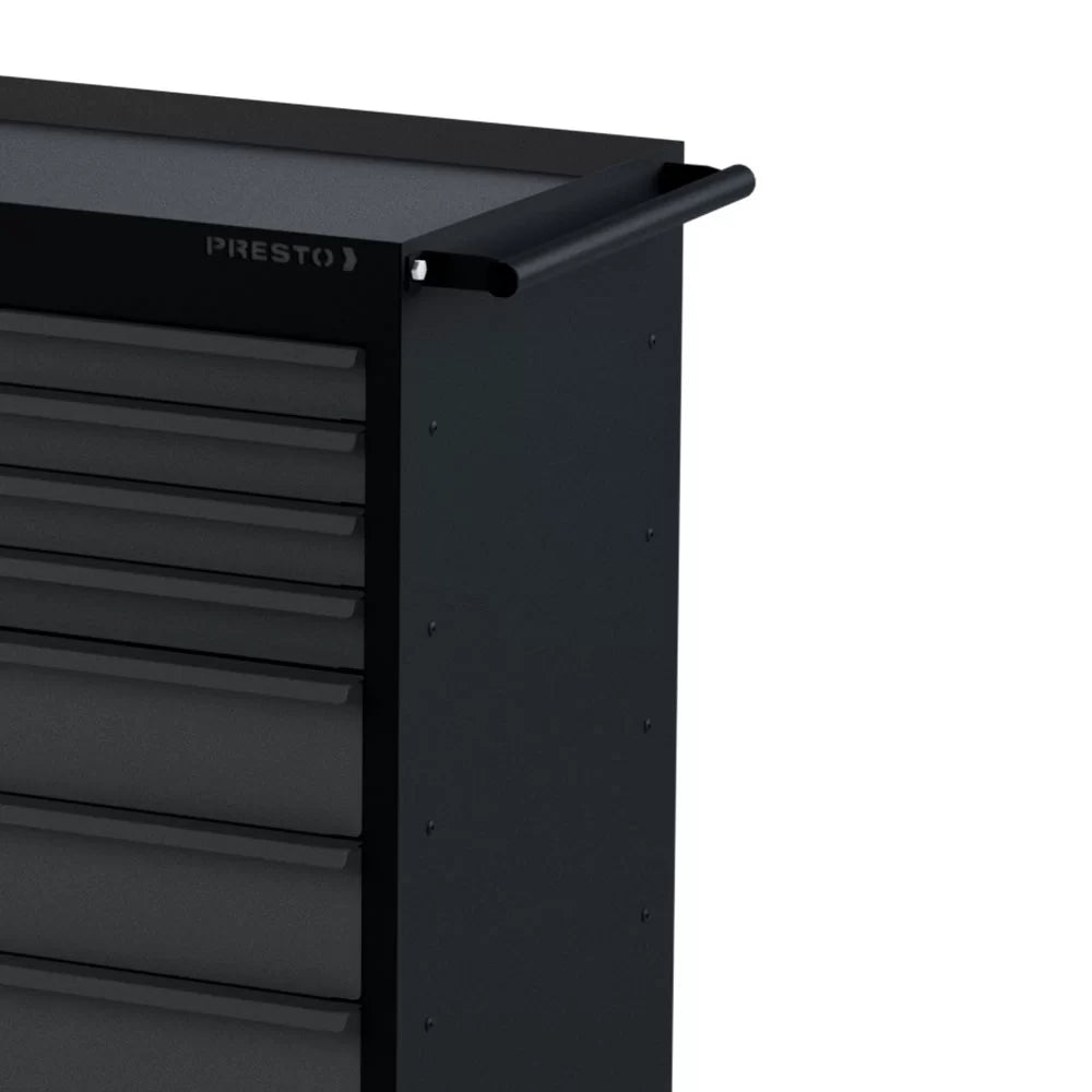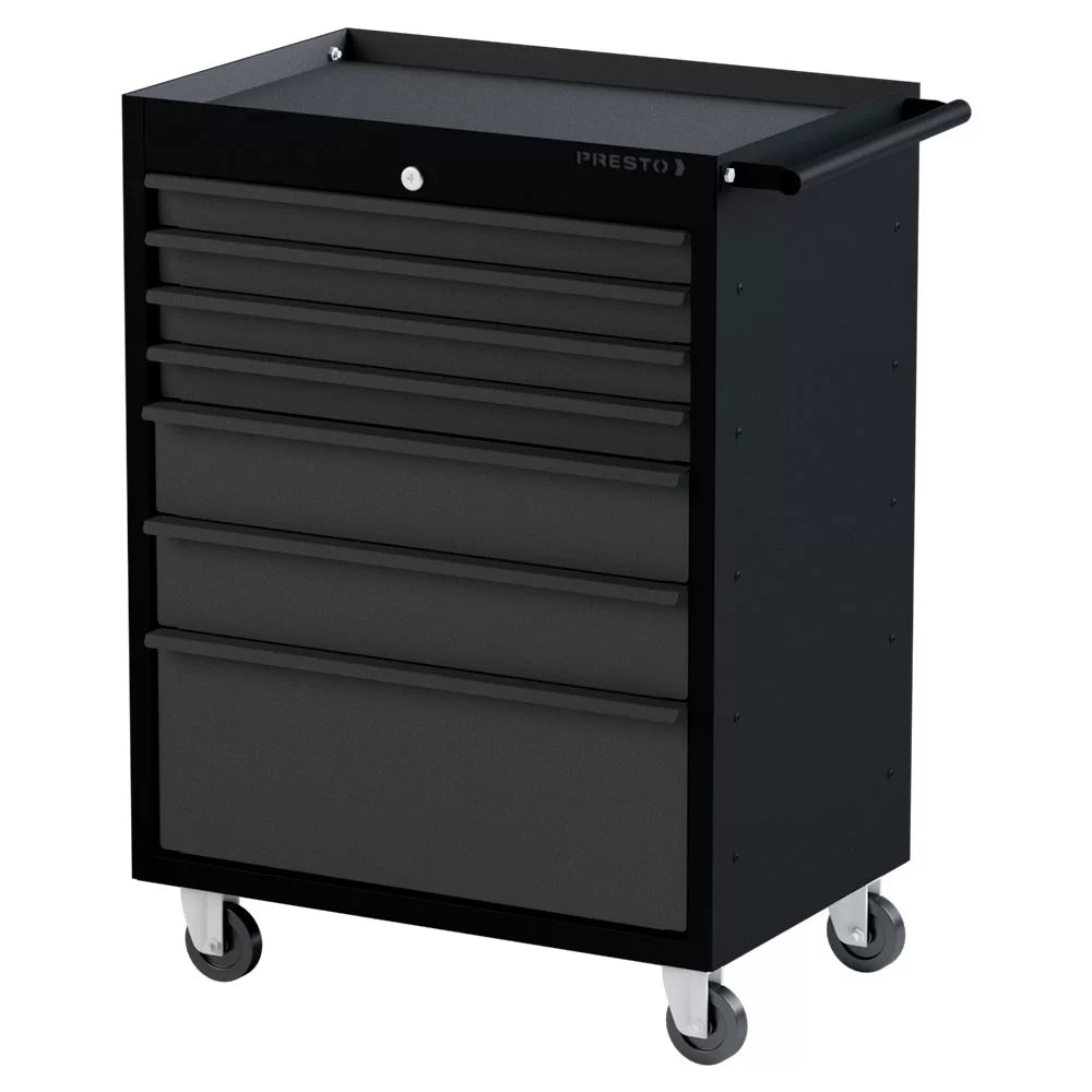 O Carro para Ferramentas Profissional da Presto com 7 gavetas é robusto e funcional. Tem capacidade de carga de até 250kg distribuídos e permite o acondicionamento e transporte, já que conta com 4 rodízios de 4”, sendo 2 fixos e 2 giratórios com freio.