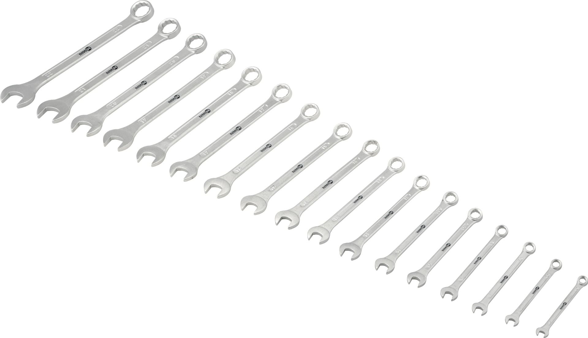 1 Jogo de chaves combinadass, composto por um suporte plástico com 17 peças, sendo: 6,0 mm, 7,0 mm, 8,0 mm, 9,0 mm, 10,0 mm, 11,0 mm, 12,0 mm, 13,0 mm, 14,0 mm, 15,0 mm, 16,0 mm, 17,0 mm, 18,0 mm, 19,0 mm, 20,0 mm, 21,0 mm e 22,0 mm.
