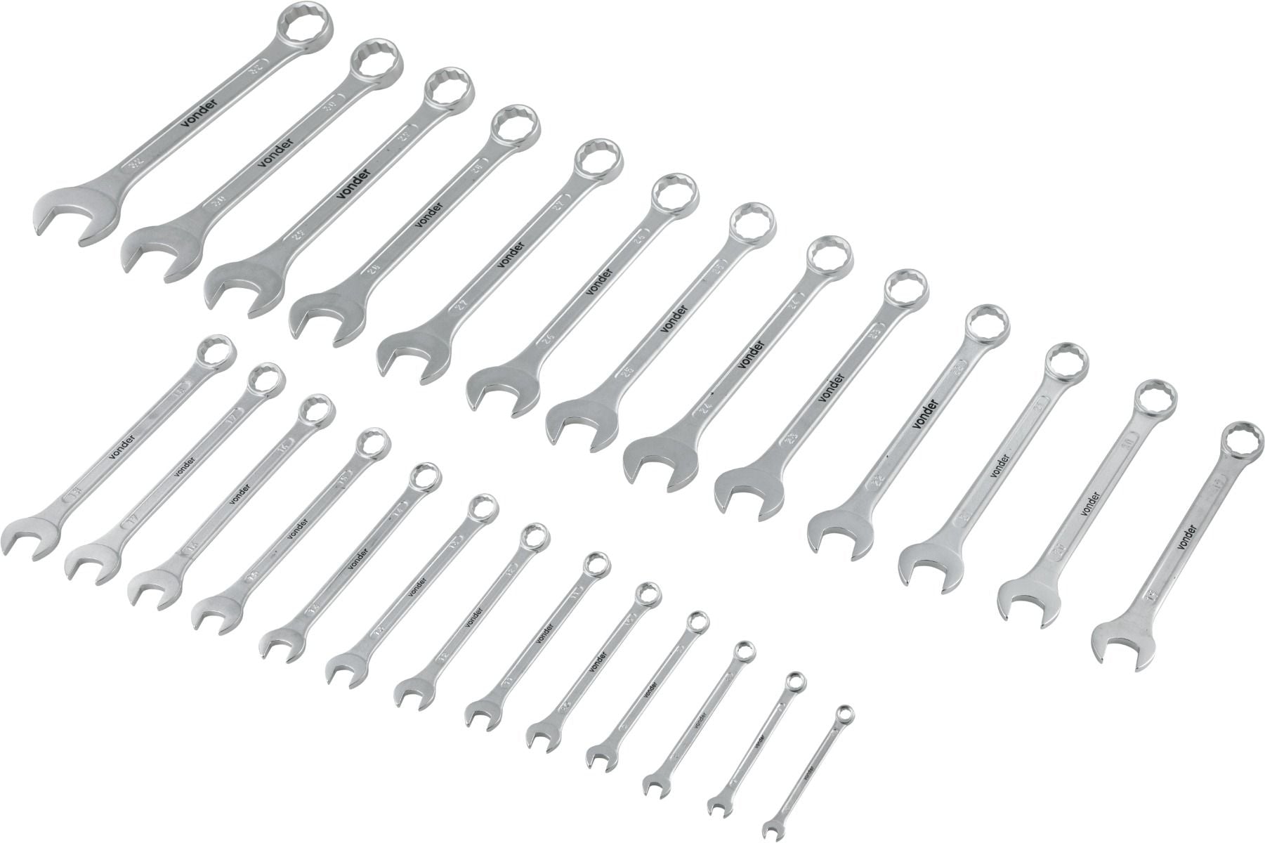 1 Jogo de chaves combinadass, composto por um suporte plástico com 26 peças, sendo: 6 mm, 7 mm, 8 mm, 9 mm, 10 mm, 11 mm, 12 mm, 13 mm, 14 mm, 15 mm, 16 mm, 17 mm, 18 mm, 19 mm, 20 mm, 21 mm, 22 mm, 23 mm, 24 mm, 25 mm, 26 mm, 27 mm, 28 mm, 29 mm, 30 mm e 32 mm.