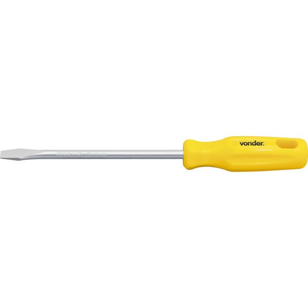 Conteúdo da embalagem 1 Chave de fenda Aplicações e dicas de uso Indicada para fixar e soltar parafusos com fenda simples Destaques e diferenciais Produzida em aço cromo vanádio, proporcionando maior resistência e durabilidade. Possui acabamento niquelado que confere maior resistência contra oxidação/corrosão. Conta com ponta magnetizada que facilita tanto a colocação quanto a retirada de parafusos em locais de difícil acesso. Cabo anatômico em polipropileno que garante maior conforto ao operador.