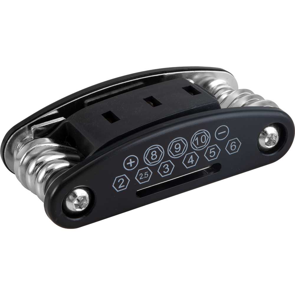 Chave multifunção para bicicleta, composta por 1 suporte 15 em 1 sendo: 6 chaves allen (2,0 mm - 2,5 mm - 3,0 mm, 4,0 mm - 5,0 mm - 6,0 mm), 1 chave phillips (PH1), 1 chave de fenda (5 mm), 3 soquetes sextavados encaixe quadrado de 1/4" (8,0 mm - 9,0 mm - 10,0 mm) ,1 cabo adaptador e 1 chave múltipla (8,0 mm - 10,0 mm - 15,0 mm).