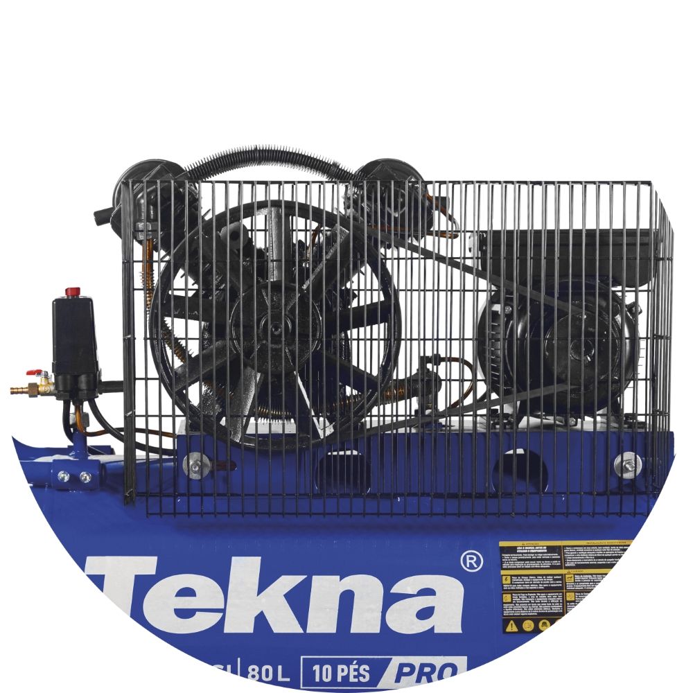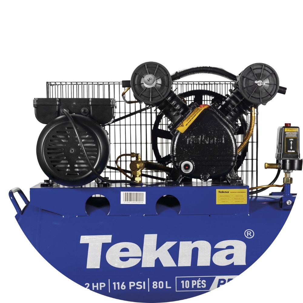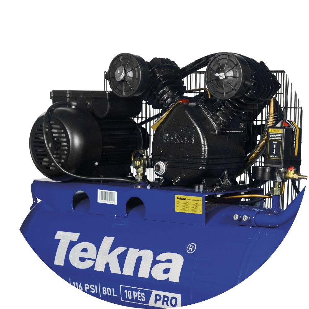 Compressor de ar, Tekna CP10080P-1, motor elétrico, 2 HP, reservatório de 80 litros, pressão máxima, pés de borracha, pressostato automático, rodas, alto rendimento, uso profissional, cabeçote em V, ferramentas pneumáticas.