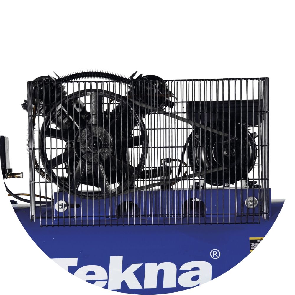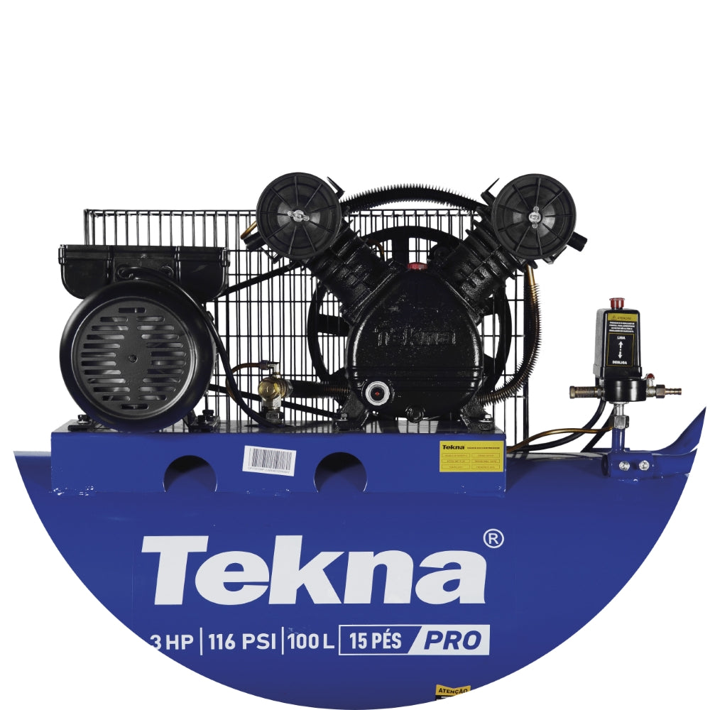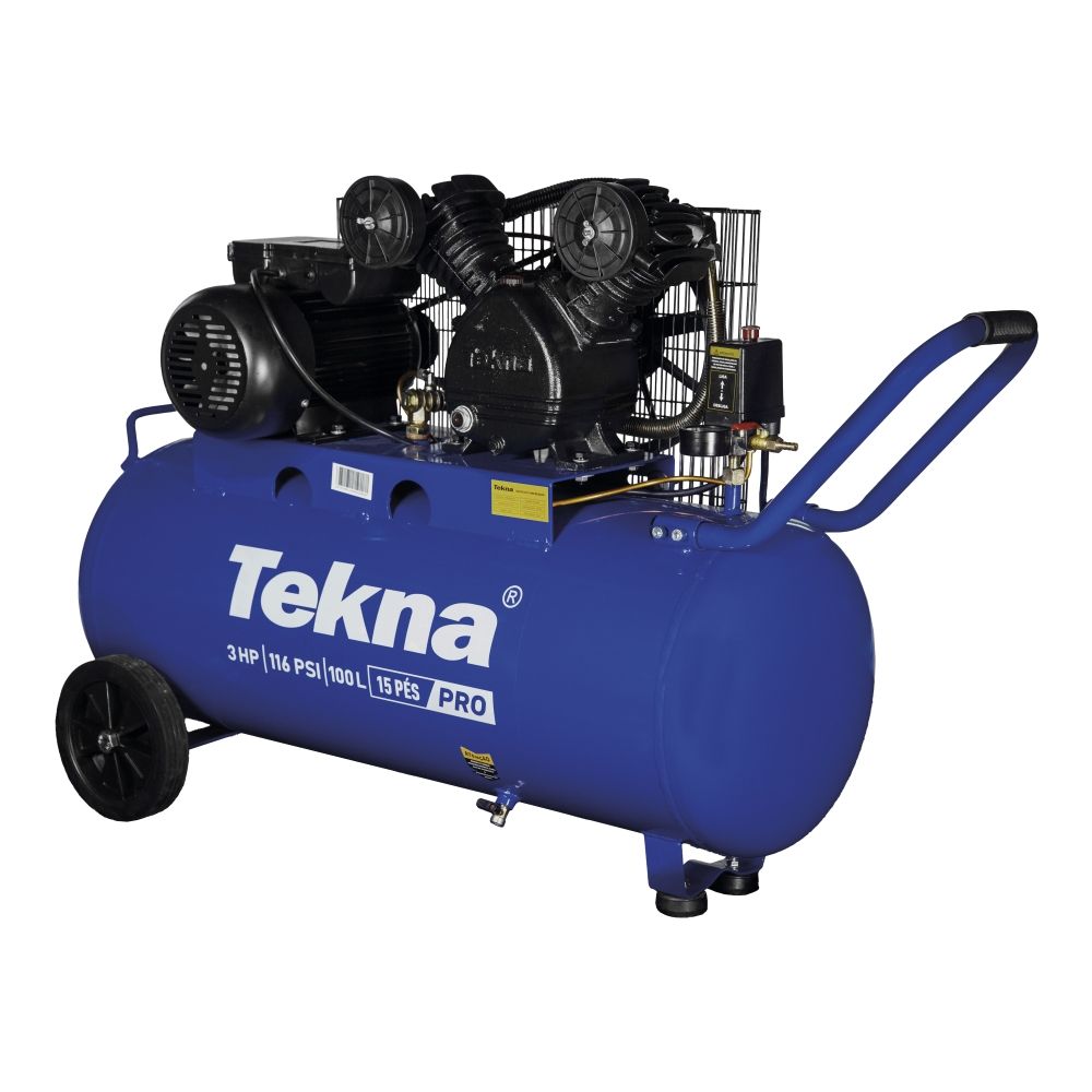 Compressor de ar, Tekna CP150100P-2, motor elétrico, 3 HP, reservatório de 100 litros, pressão máxima, pés de borracha, pressostato automático, rodas, alto rendimento, uso profissional, cabeçote em V, ferramentas pneumáticas.