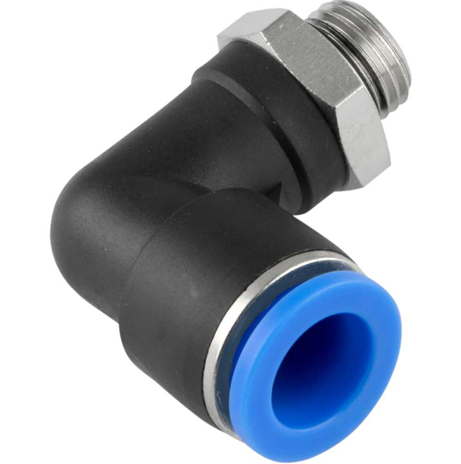 Conexão tipo cotovelo com rosca BSP e engate rápido, usada em tubos PU de ar comprimido.