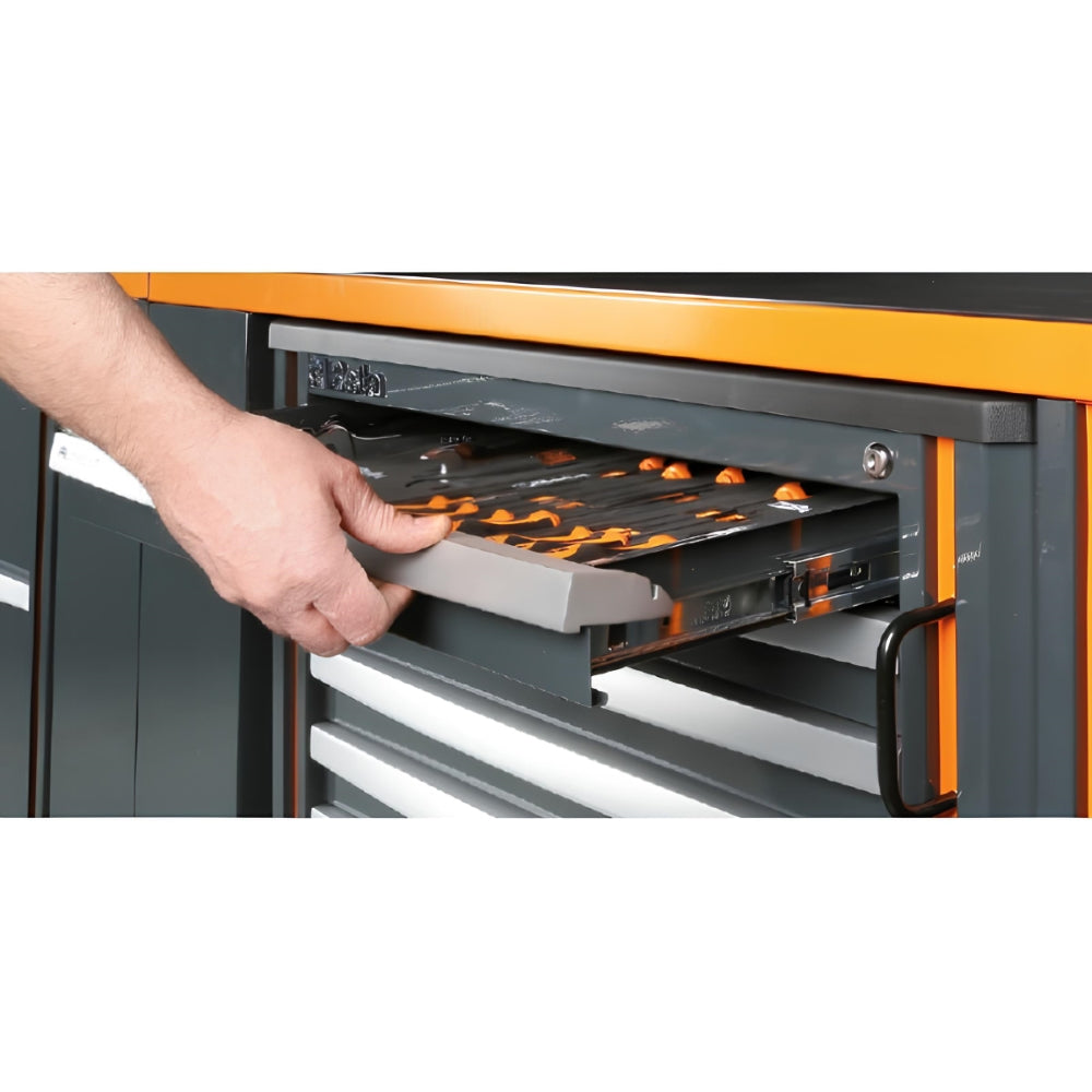 Organização Eficiente: A combinação de armários, gavetas e painéis de ferramentas permite uma organização eficiente, mantendo todas as ferramentas ao alcance.