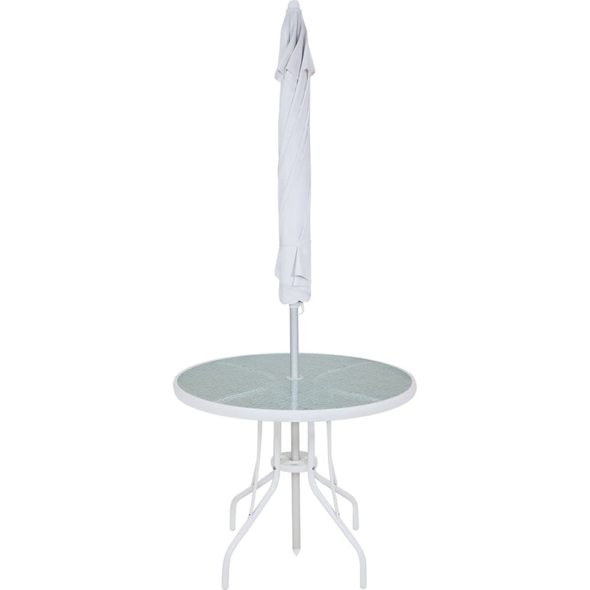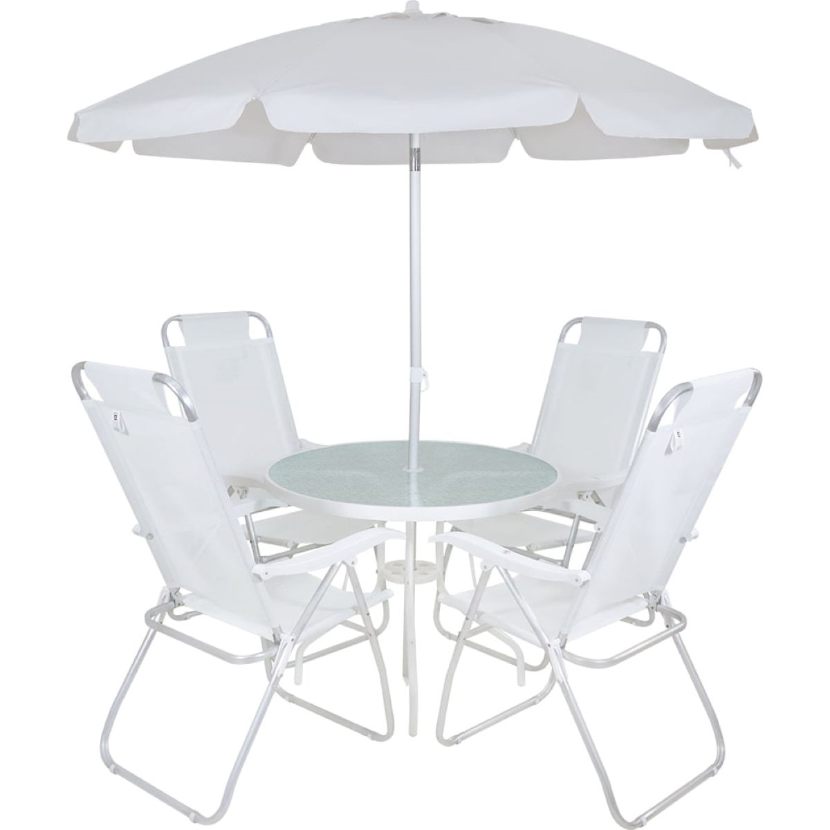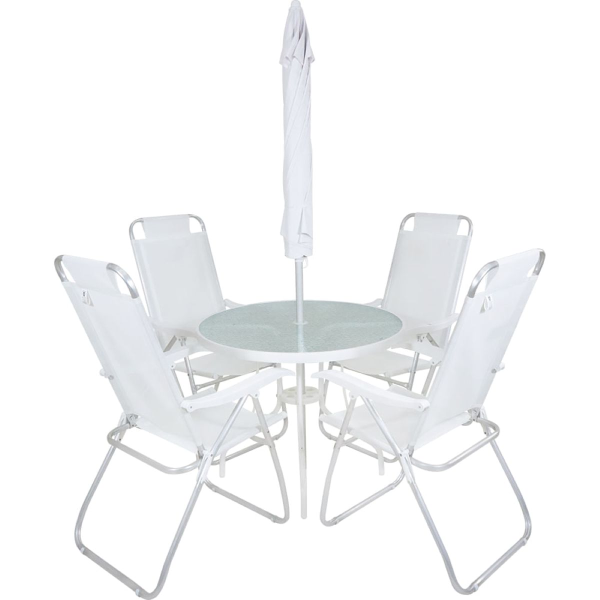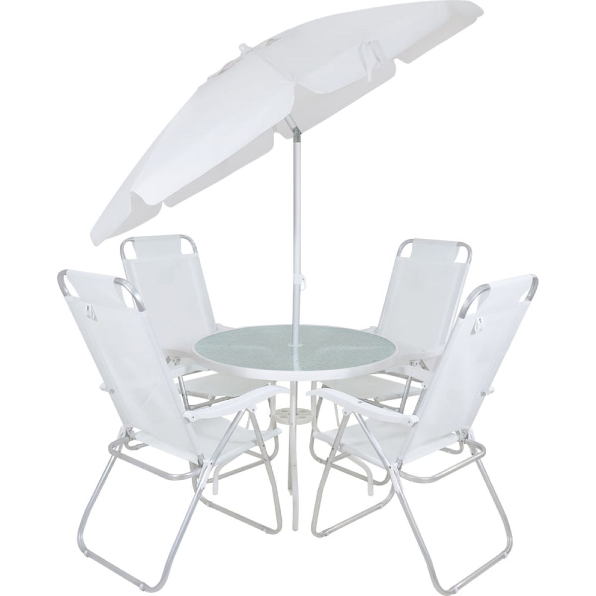 Conteúdo da embalagem: 1 Conjunto Noronha Branco com Mesa 4 Cadeiras e Guarda Sol