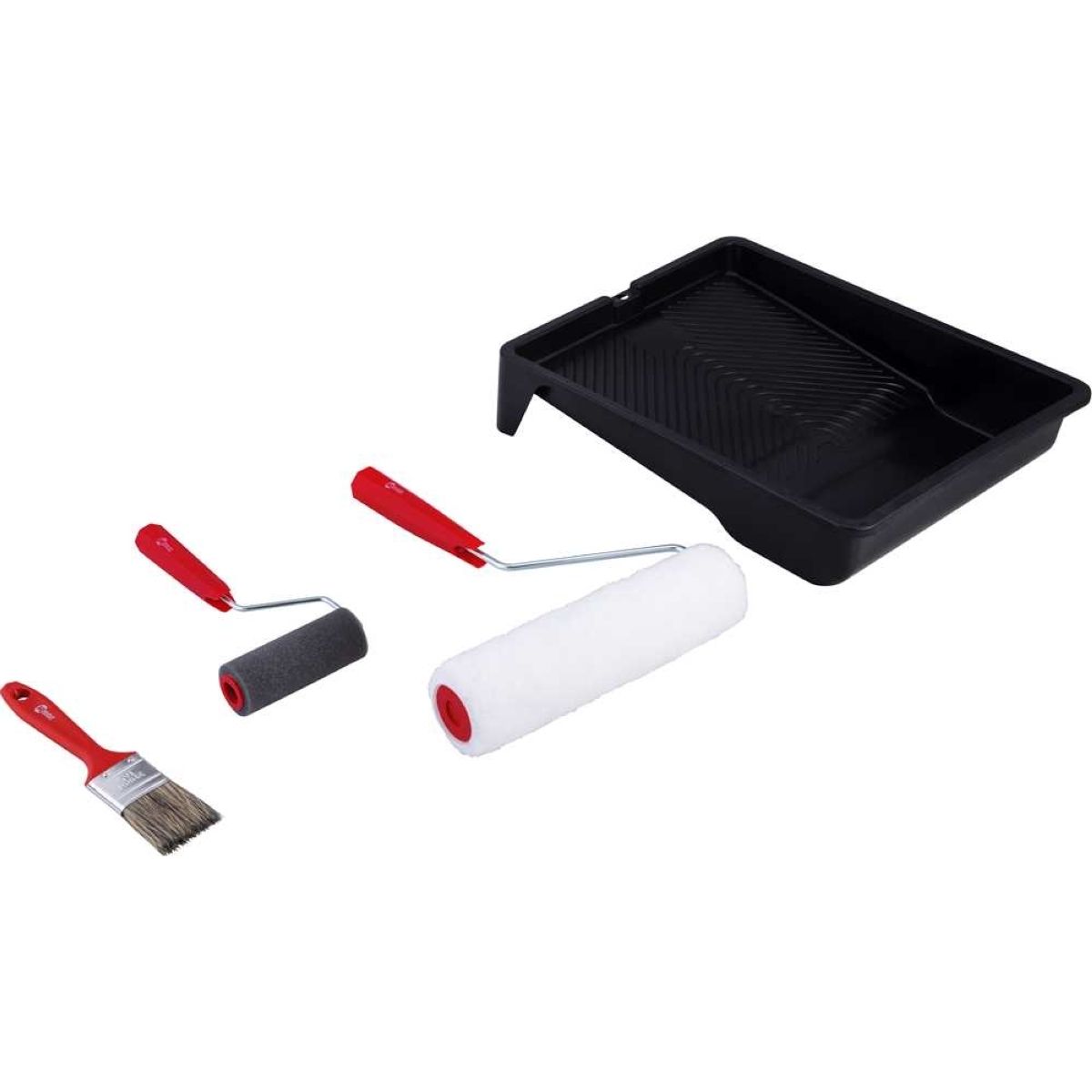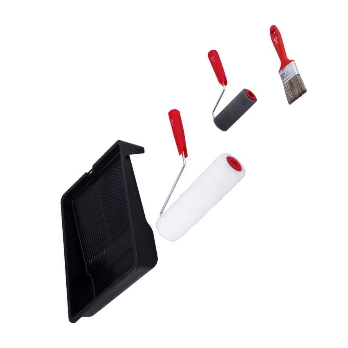 Composição (jogo): 1 bandeja de pintura 23 cm, 1 pincel 1.1/2", 1 rolo de espuma 9 cm, 1 suporte para rolo 23 cm e 1 rolo de lã 23 cm