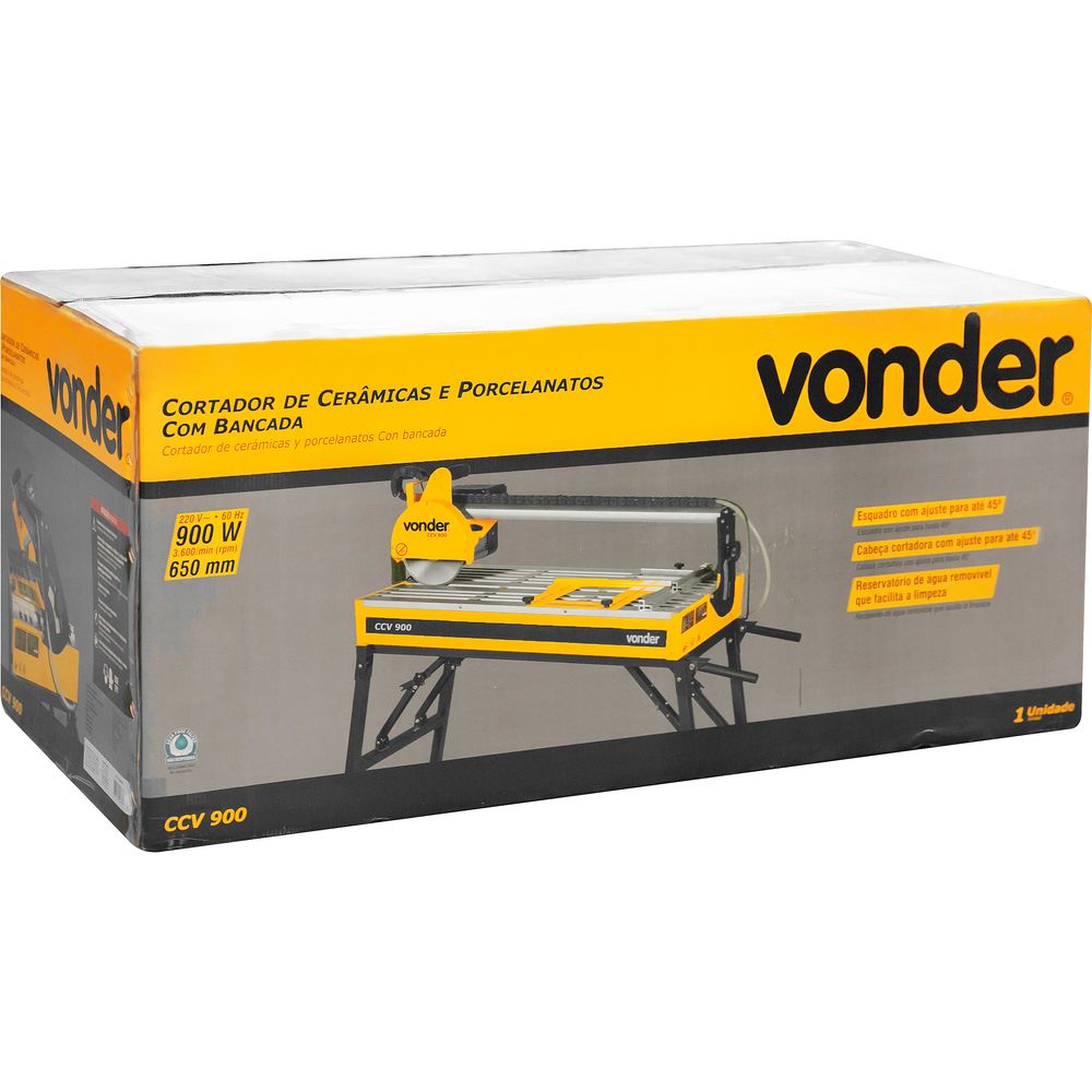 1 Cortador de cerâmicas e porcelanatos, acompanha: 1 disco de corte diamantado de 200 mm, 1 guia de corte reto, 1 guia de corte em ângulo, 2 alças, 1 jogo de rodas, 1 chave canhão, 1 chave 2 pinos e 1 chave phillips