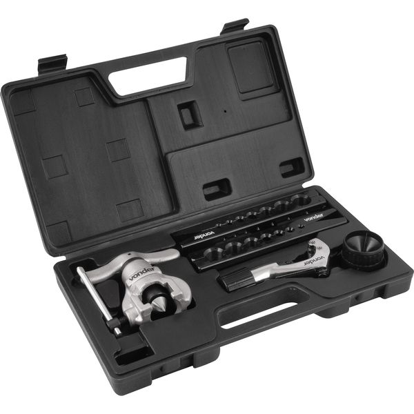 1 Jogo de cortador e flangeador de tubos com 6 peças, sendo: 1 maleta plástica, 1 flangeador, 2 bases de fixação dos tubos, 1 cortador de tubos e 1 rebarbador