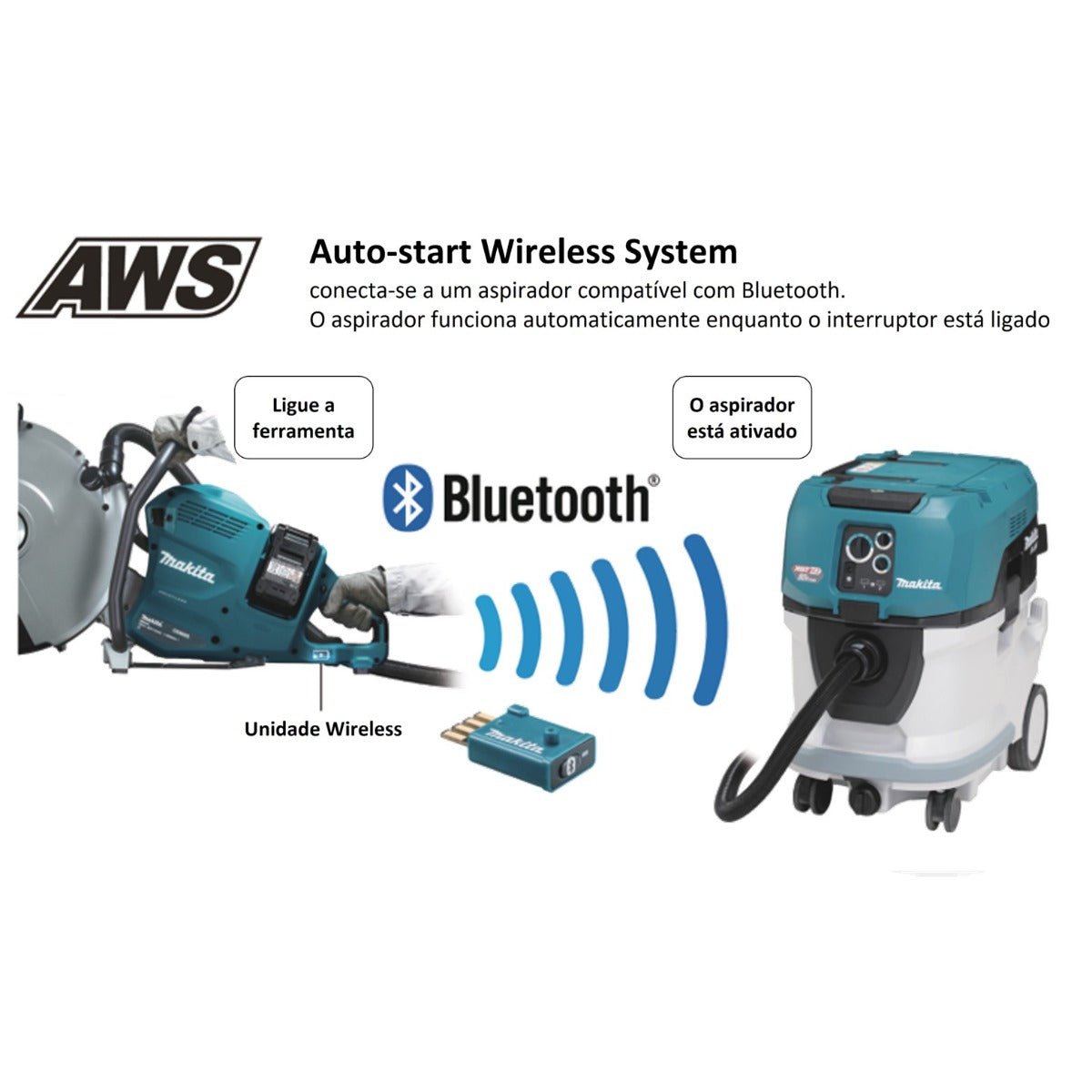 A segurança é um dos grandes diferenciais desta cortadora. A tecnologia AFT (Active Feedback Technology) desliga automaticamente o motor caso o disco trave ou perca velocidade repentinamente, reduzindo o risco de acidentes. O Auto Start Wireless System (AWS) permite a conexão via Bluetooth com aspiradores compatíveis, otimizando ainda mais a operação sem necessidade de fios.