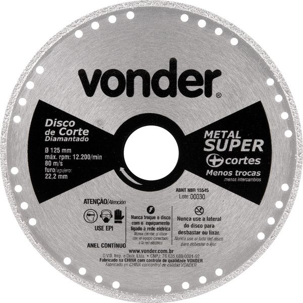 Disco de corte diamantado, contínuo, para metais, metal super, 125 mm, VONDER