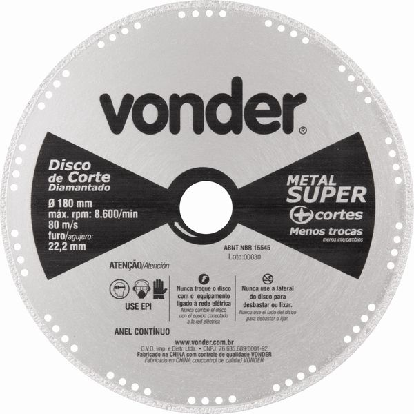 Disco de corte diamantado, contínuo, para metais, metal super, 180 mm, VONDER