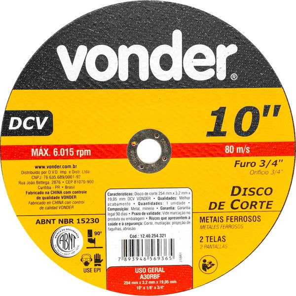 Disco de corte 254 mm x 3,2 mm x 19,05 mm DCV VONDERAplicações e dicas de uso: