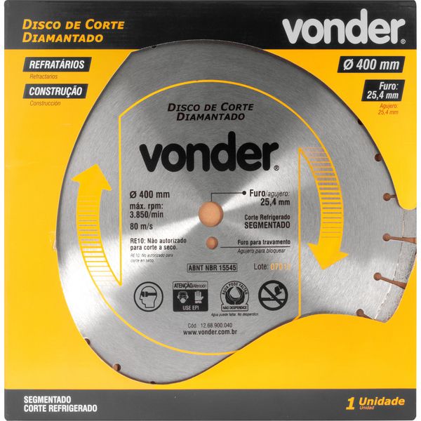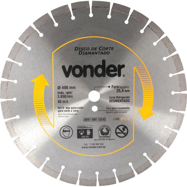 Indicado para operações de corte a úmido de materiais refratários e de construção. Utilizado em cortadores compatíveis com o diâmetro e furo do disco. Velocidade periférica máxima: 80 m/s.