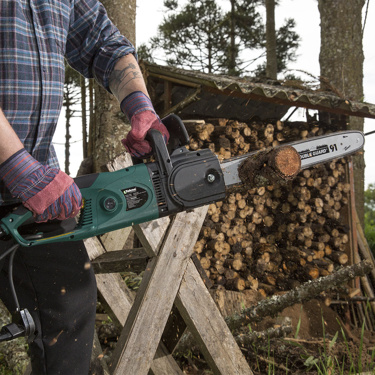 A Eletrosserra Tekna ES22002 possui motor universal com escovas de 2200 W de potência, sabre e corrente Oregon, que oferecem alta performance e desempenho no corte.