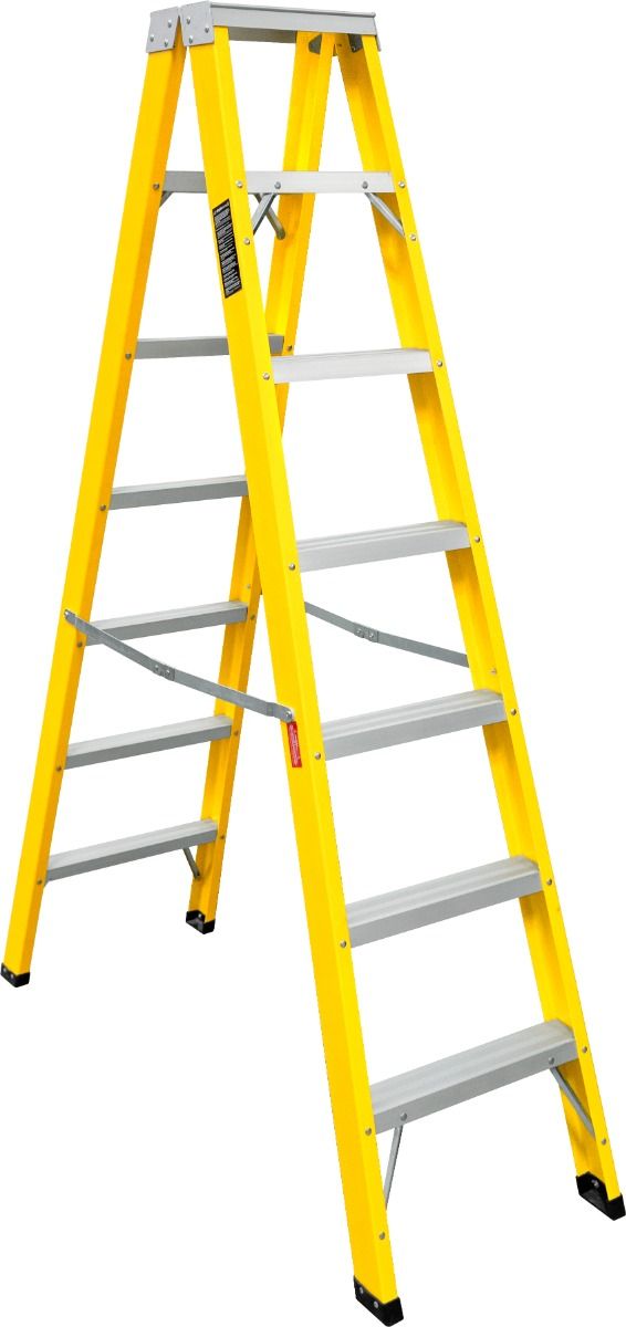 Possui longarinas não condutivas em perfil tipo “U” de fibra de vidro na cor amarela e degraus largos tipo plataforma, fabricados em alumínio com ranhuras antiderrapantes e fixados diretamente nos perfis por rebites. Conta com um limitador de abertura e 4 sapatas de borracha antiderrapantes.