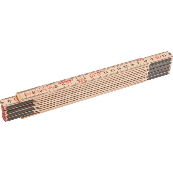 Graduação da escala : mm Comprimento da escala métrica: 2 m Tipo de marcação da escala: Pintada Espessura da escala : 2,4 mm Material da escala: Madeira Largura da escala: 17,3 mm Classe de precisão : Classe III Número de dobras da escala métrica: 10