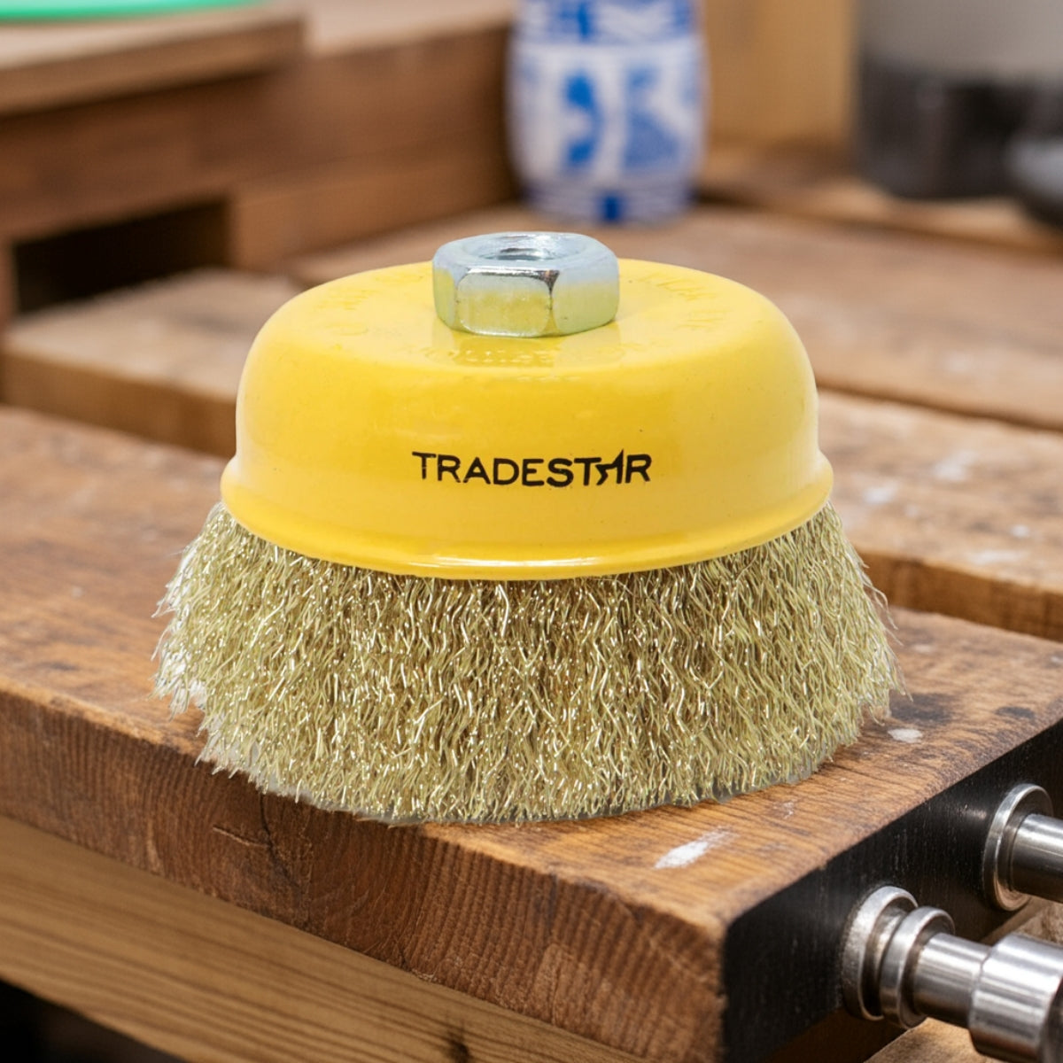 A Escova Copo Tradestar 4" em Aço Carbono Ondulado com Rosca M14 é indispensável para serviços de limpeza pesada, preparação e restauração de superfícies. Seu formato em copo com cerdas onduladas de aço carbono latonado garante maior cobertura e ação uniforme, removendo sujeiras incrustadas sem danificar excessivamente o material.
