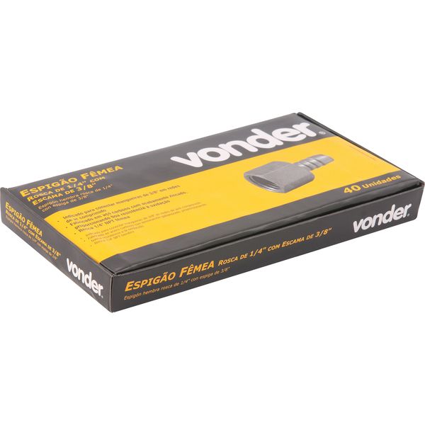 Medida da rosca do espigão para mangueira: 0.1/4 " Tipo da rosca do espigão para mangueira: NPT - Fêmea Medida da escama do espigão para mangueira: 0.3/8 " Material do espigão para mangueira: Aço zincado