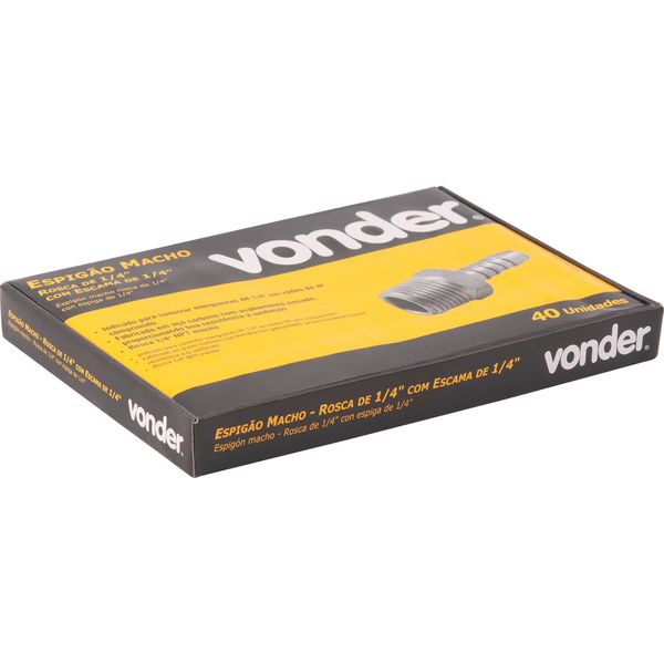 Medida da rosca do espigão para mangueira: 1/4" Tipo da rosca do espigão para mangueira: NPT - Macho Medida da escama do espigão para mangueira: 1/4" Material do espigão para mangueira: Aço zincado