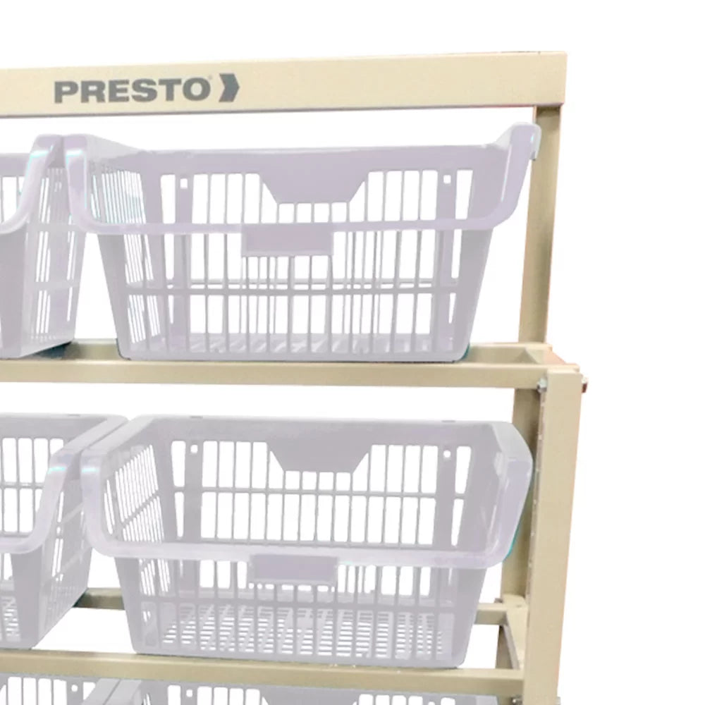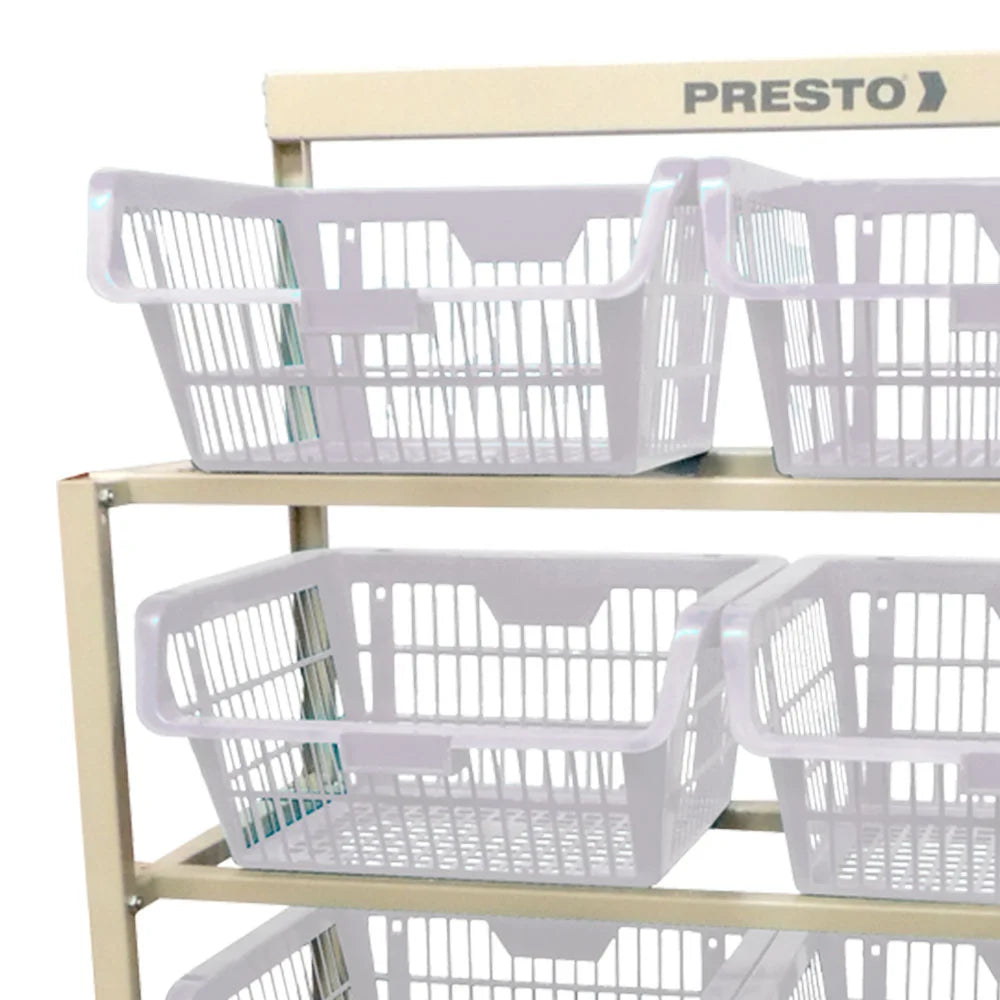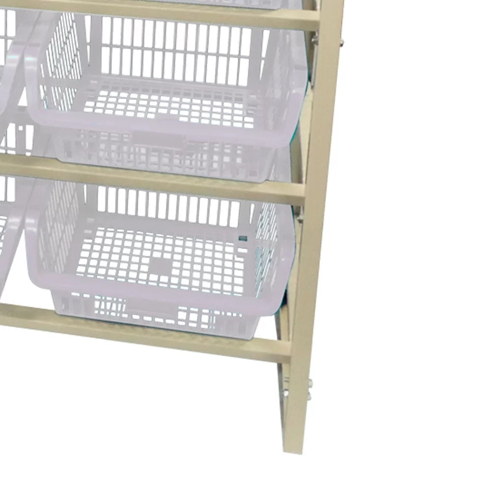 ESTANTE CESTO EXPOSITOR Branco Estrutura em aço com acabamento com sistema de tratamento químico (antiferruginoso e fosfatizante) e pintura através de sistema eletrostático a pó com camada de 70 micras, montada através de parafusos e porcas. Contém 10 unidades de cestos prático totalmente confeccionado em polipropileno reciclado moldado pelo sistema de injeção termoplástica composto de um corpo com cantos reforçados de paredes laterais, frontal e posterior vasadas em retângulos de 15x52 com espessura média de 2,5mm nas linhas verticais e de 1,20mm nas linhas horizontais e fundo em quadros de 15x15 com espessura média de 3,00mm. Borda superior reforçada por nervuras na parte inferior do mesmo e encaixe para montagem do pé e para empilhamento. Porta etiqueta com 75mm de largura e 24mm de altura formado na própria peça centralizada na parte frontal da borda superior e área para implantação de adesivo no formato trapezoidal com dimensões mínimas de 80mm de largura e 35mm de altura centralizado na face interna posterior do corpo do cesto. Face inferior do cesto com reforço em seu perímetro por nervura. É ideal para organizar componentes e conexões, pois facilita o acesso rápido a itens necessários para realizar o trabalho de maneira mais ágil e organizada.