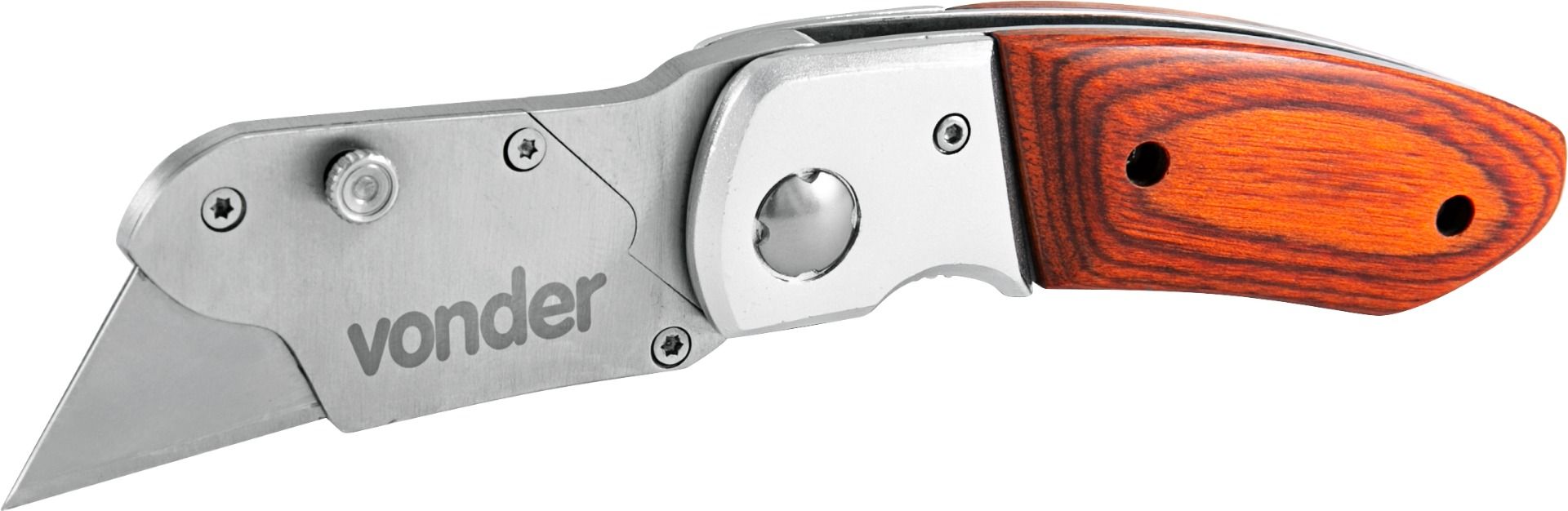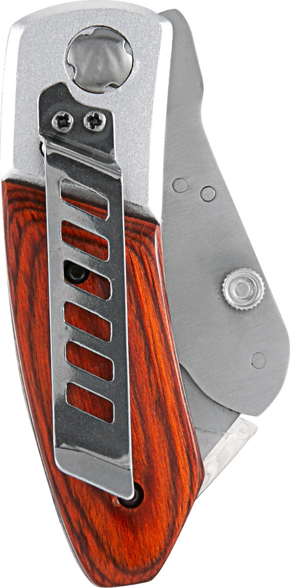 Possui corpo em aço inox, cabo de madeira, botão trava para a lâmina e clipe para cinto.